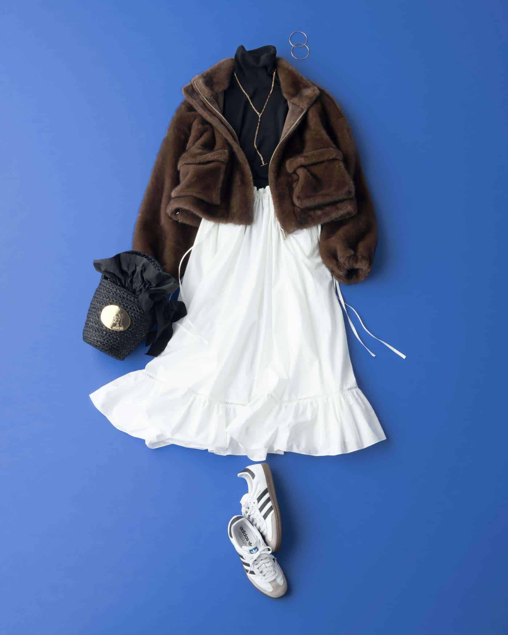 ファーブルゾン(着回し)ニット(SLOANE)スカート(DRAWER)バッグ(PATOU)靴(adidas)ネックレス(Pascale Monvoisin)ピアス(MARIHA)(すべて本人私物)