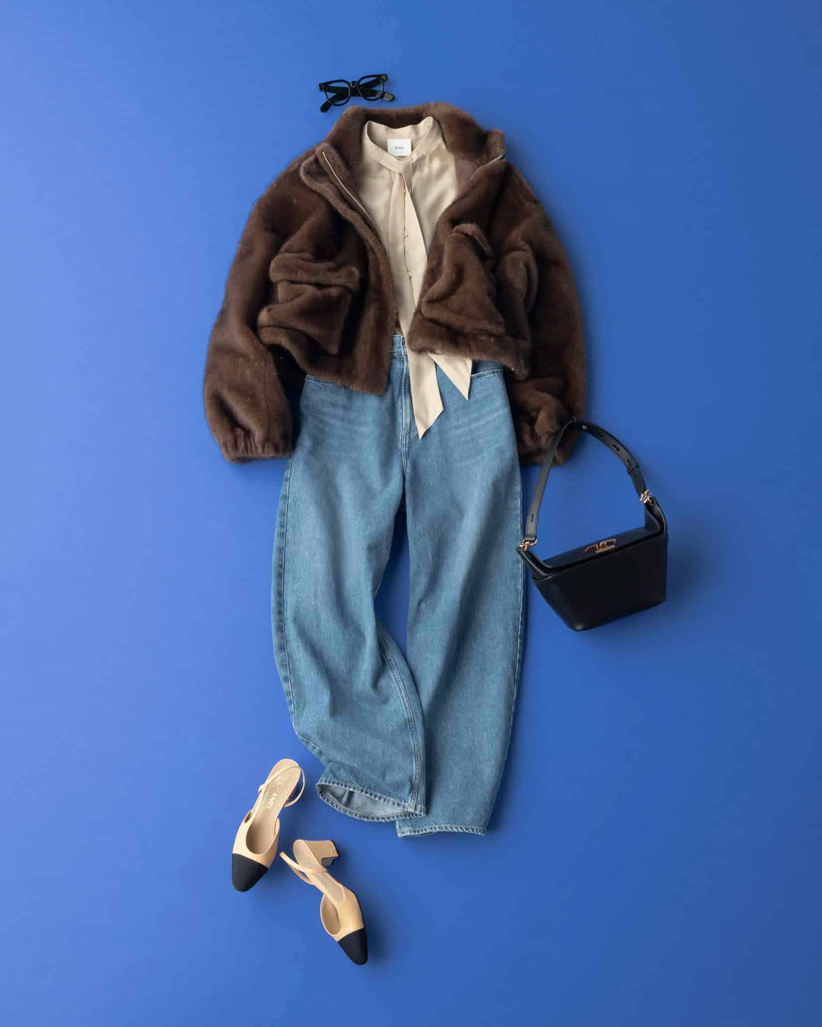 ファーブルゾン(着回し)ブラウス(RETROVE)デニム(upper heights)バッグ(TOD‘S)靴(CHANEL)メガネ(JURIUS TART OPTICAL)(すべて本人私物)