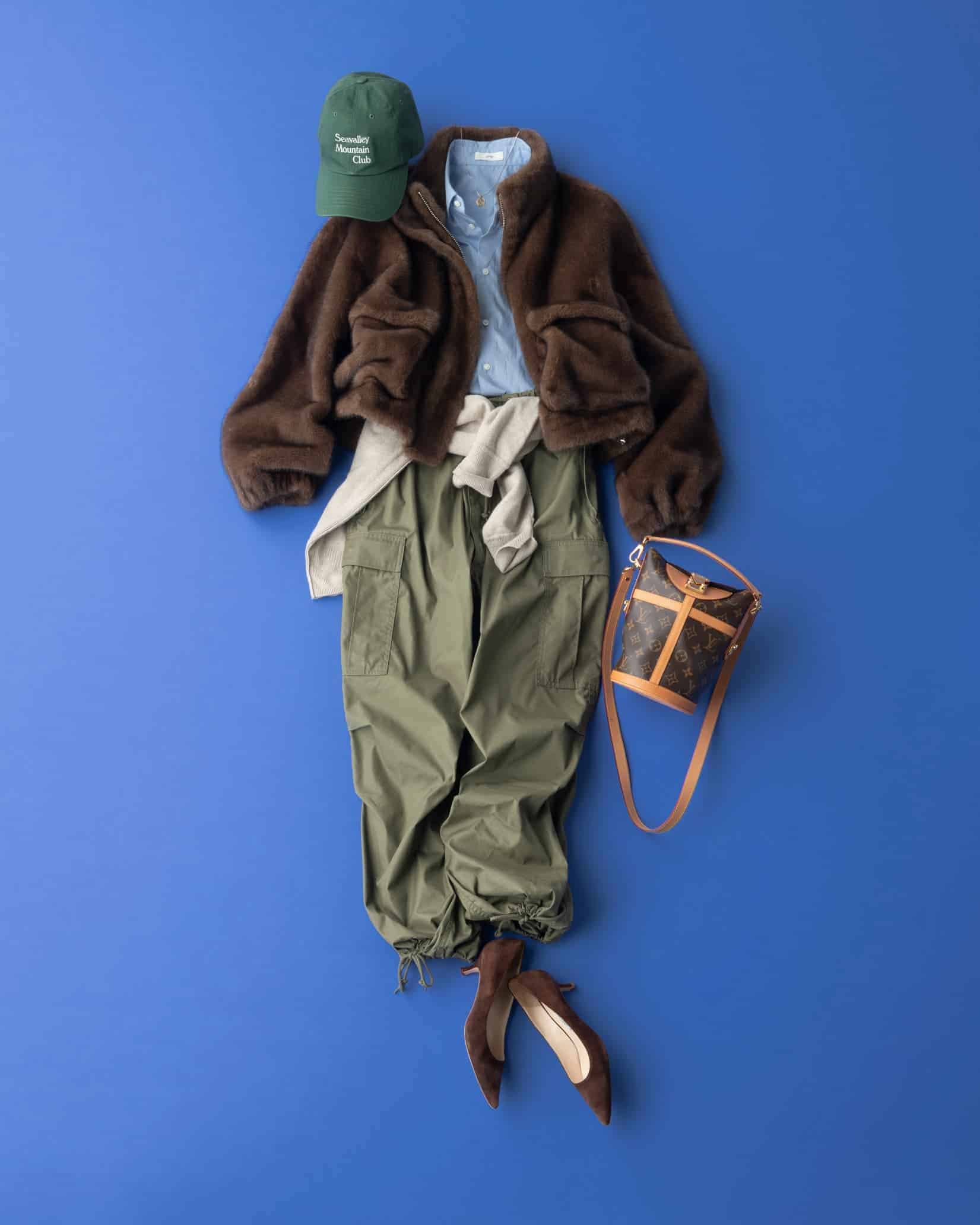 ファーブルゾン(着回し)シャツ(ATON)パンツ(HYKE)ニット(DEPAREILLE)キャップ(SEA)バッグ(Louis Vuitton)靴(NEBULONI E.)ネックレス(Pascale Monvoisin)(すべて本人私物)
