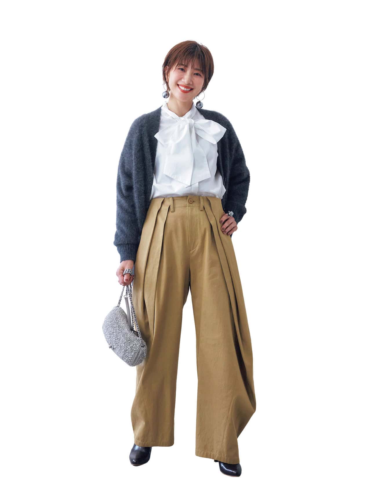 パンツ¥17,600(カデュネ)カーディガン¥27,940(ネイヴ/ネイヴ〈オンワード樫山〉)ブラウス¥17,600(ヘルシーデニム/ゲストリスト)バッグ¥42,900(ヴァジック/ヴァジックジャパン)シューズ¥24,200(オデット エ オディール/オデット エ オディール 新宿店)ピアス¥19,800(リューク)