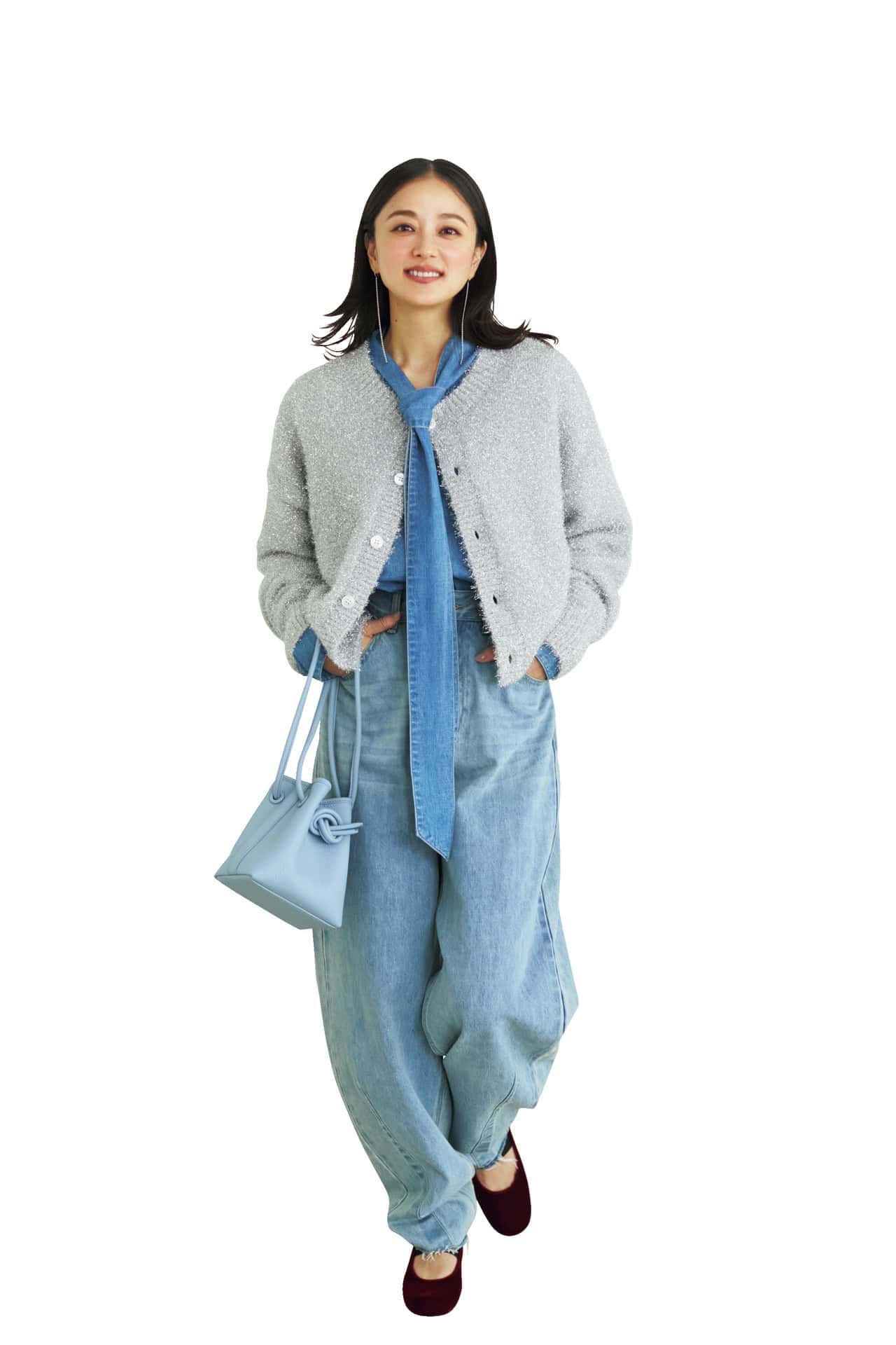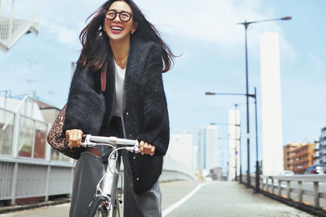 カーディガン¥36,300(プランクプロジェクト/プランクプロジェクト 青山店)タンクトップ¥19,800(デ・プレ)デニム¥10,450(ミラ オーウェン/ミラ オーウェン ルミネ新宿2店)バッグ¥58,300(アバケーション)ピアス¥31,900ネックレス¥44,000(ともにオクチジュエリー/フラッパーズ)眼鏡¥50,600(パイン/フォレストパイン・デザインラボ)