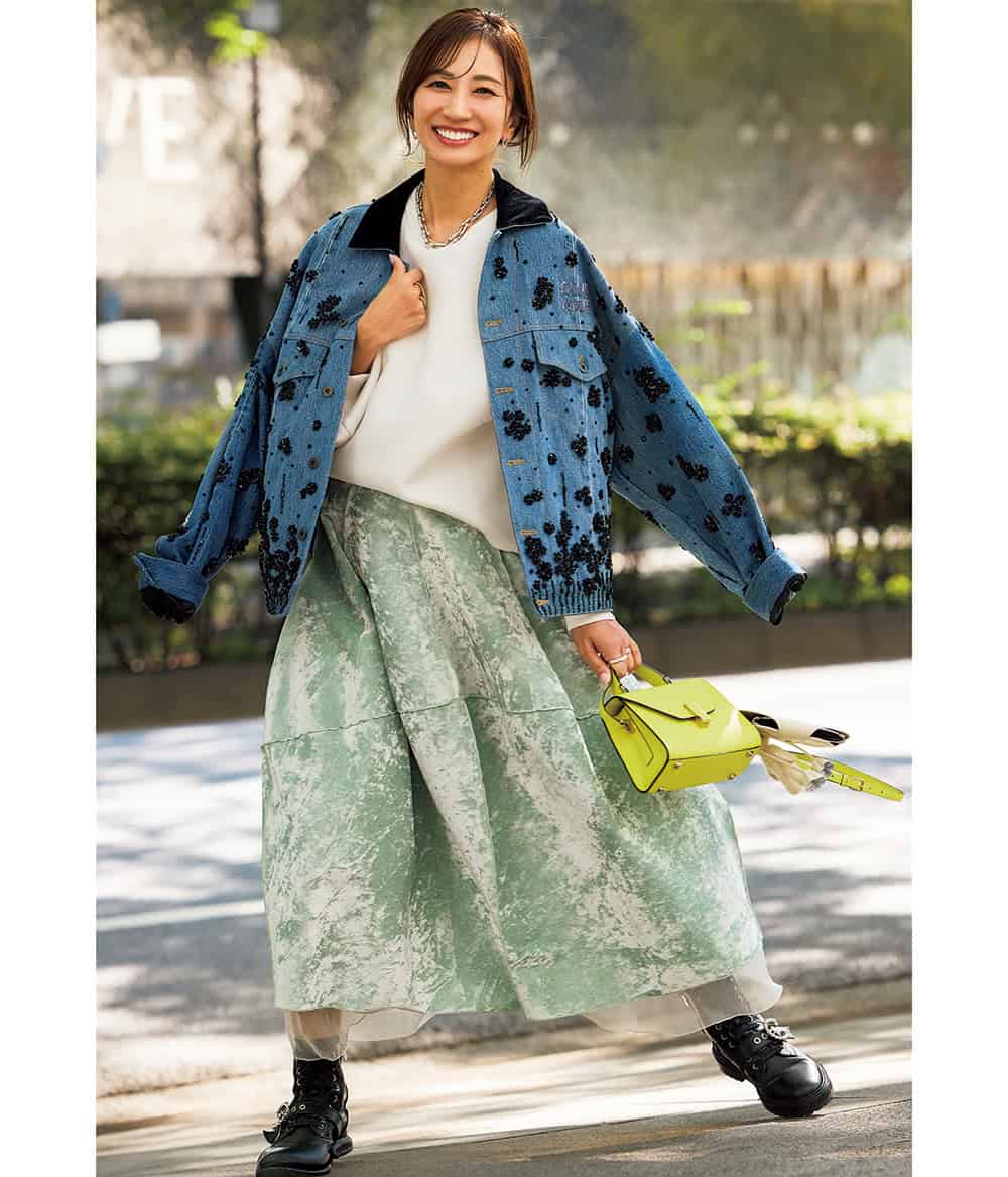 SNSやSTORYのインスタライブではワンツーコーデでもパッと華やぐコーデを意識し、見ている方の参考になるよう心掛けています。好きなものを貫き、50代になる頃には自分軸のオシャレを確立したい。学校や仕事、お出かけなど、予定が入り組む日は、1日に5回も着替えることも。ファッションを使い分け、普段とは違うキャラになりきるのも楽しいんです。