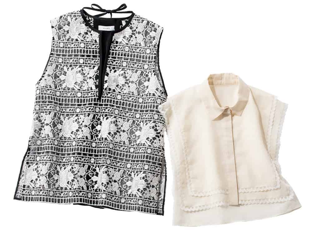ブラウス[右]¥25,000(シーニュ)ノースリーブブラウス[左]¥55,000(アドーア)