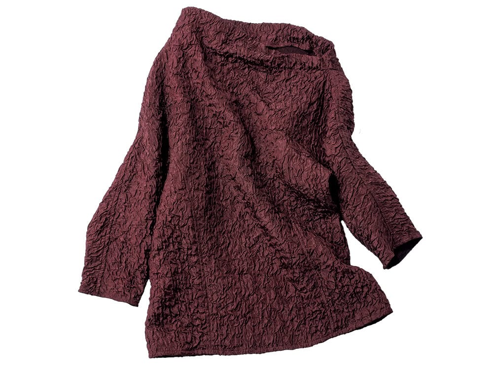 トレンドの形と素材もボルドーなら上品さをキープ。ブラウス¥30,800(ヴェニット/ハルミ ショールーム)