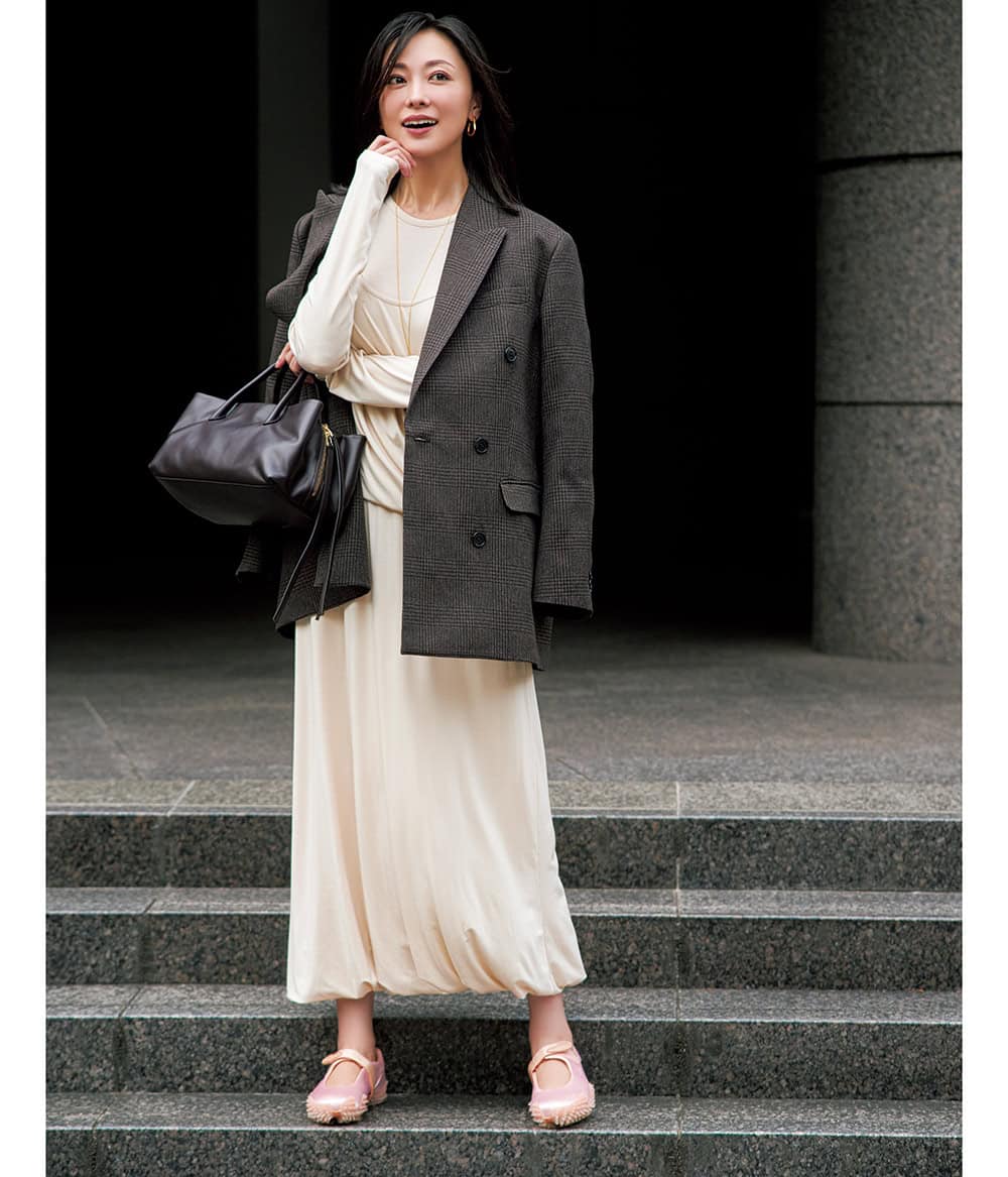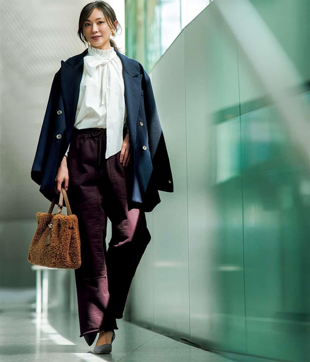 ジャケット¥86,240(テラ/ティースクエア プレスルーム)ブラウス¥28,600(エム マーリエ ル カセット/フランドルカスタマーサービス)パンツ¥36,300(フィル ザ ビル/フィル ザ ビル マーカンタイル)バッグ¥15,400(アルテミス by ダイアナ/アルテミス by ダイアナ アーバンドック ららぽーと豊洲店)パンプス¥18,150(ダイアナ/ダイアナ 銀座本店)ピアス¥25,300(エムシー・スタジオ/ズットホリック)