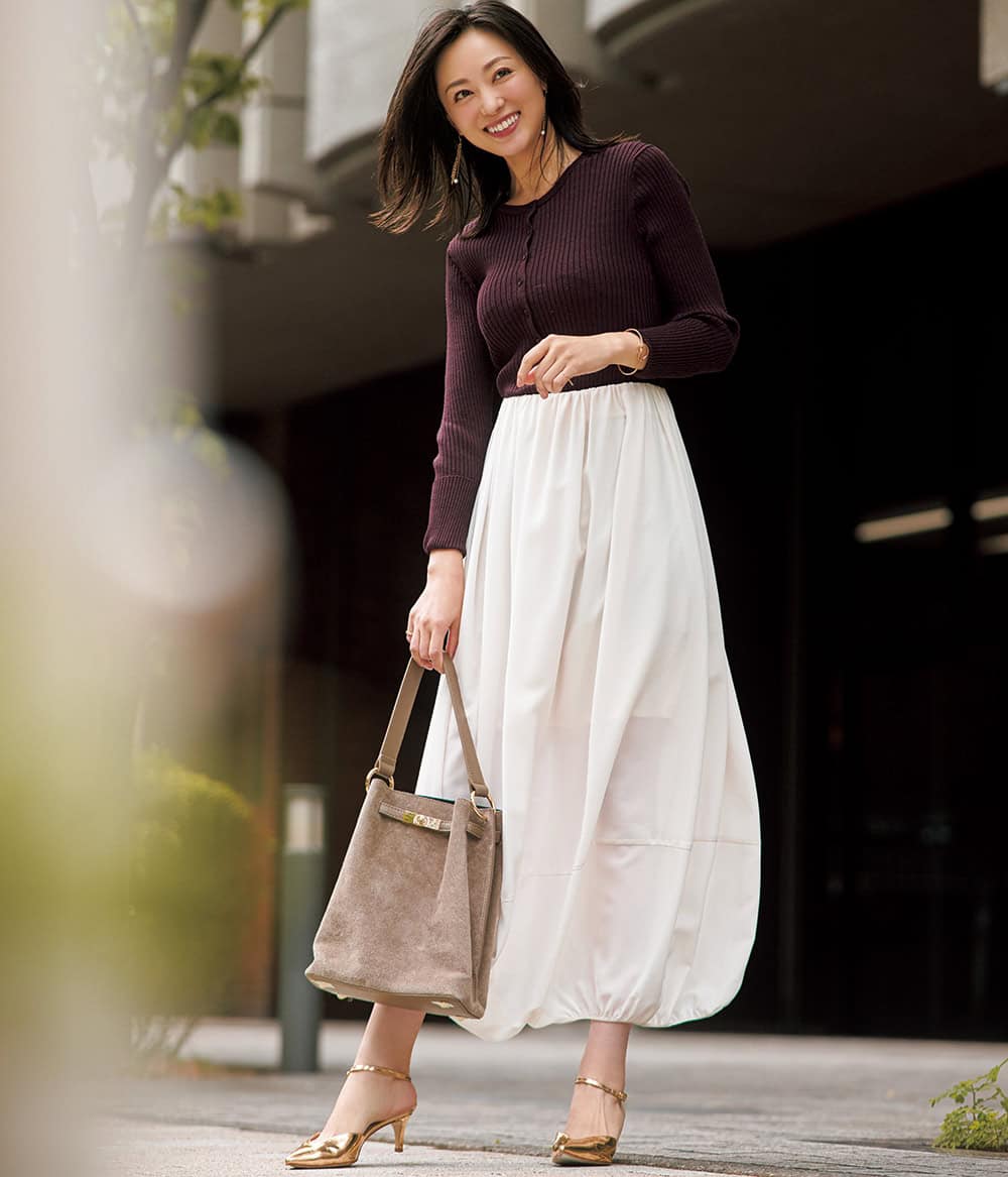 いつものコーデのスカートを変えるだけ。気取りたくないママ会は、スカートで華やかさを満喫しつつ上品なトップスで落ち着きも維持。