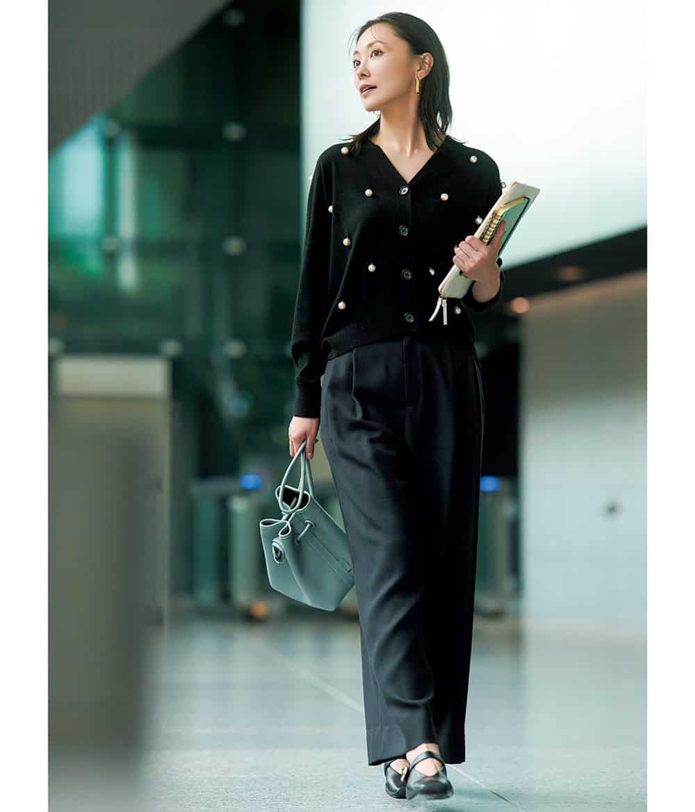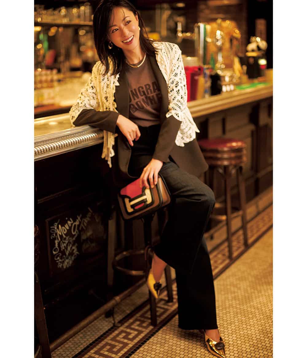 レースカーディガン¥49,500(ギャルリー・ヴィー/ギャルリー・ヴィー 丸の内店)ジャケット¥29,700(アンクレイヴ/オンワード樫山 お客様相談室)Tシャツ¥9,900(アルページュストーリー)パンツ¥13,000(PLST)バッグ¥187,000(ピエール アルディ/ピエール アルディ 東京)パンプス¥73,700(ネブローニ)ピアス¥3,800〈KRONOS〉ネックレス¥12,100〈Pearl for Life〉(ともにロードス)