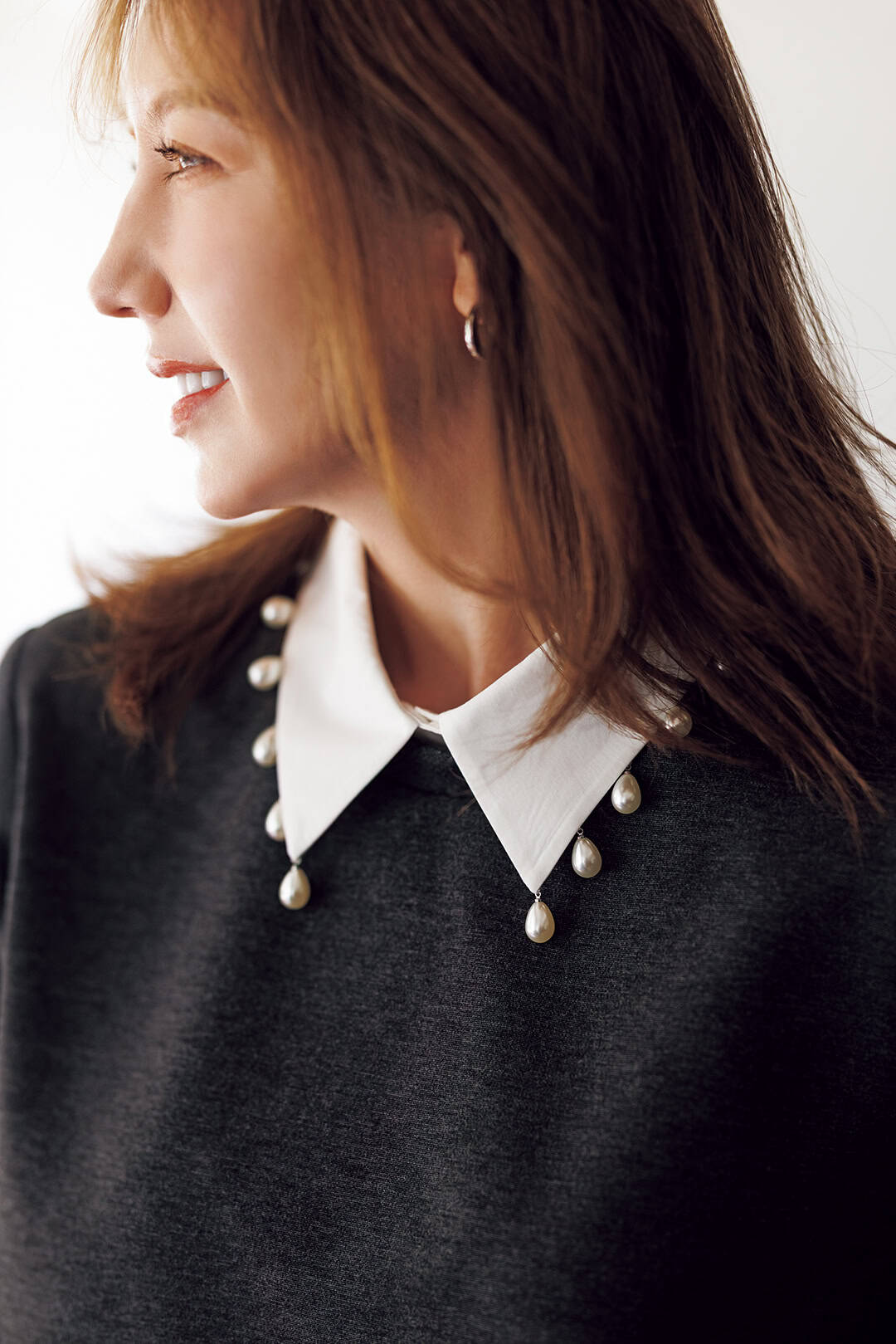 パール×白衿で上品映え。アクセいらずの"万能トップス"