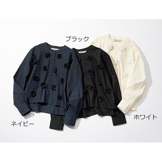 立体感のあるお花のデザインは同色なので、やりすぎ感なく自然と華やか見えを叶えます。サイドスリットで、ボトムスにアウトしてもインしても着られる程よい丈。仕事からの忘年会など日常着の延長でドラマティックに見せることができる映えブラウスは、忙しい私たちの強い味方。