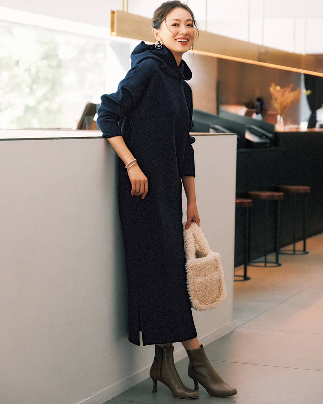 ワンピース¥7,689(ユアーズ)バッグ¥17,600(ツル バイ マリコ オイカワ)ブーツ¥31,900(ダイアナ/ダイアナ 銀座本店)ピアス¥12, 100〈ワンエーアールバイウノアエレ〉細ブレスレット¥286,000〈ウノアエレ〉太ブレスレット¥33,000〈ウノアエレシルバーコレクション〉(すべてウノアエレ ジャパン)