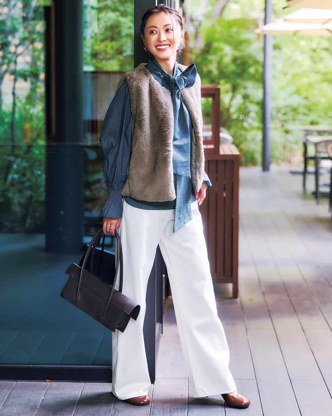 ジレ¥16,500ブラウス¥16,500(ともにALEA)パンツ¥41,800(ダブルスタンダードクロージング/フィルム)バッグ¥44,000(モフィオラ/アマン)ピアス¥19,250(ココシュニック オンキッチュ/ココシュニック)リング¥23,100(フィリアム/フォーティーン ショールーム)シューズ/スタイリスト私物