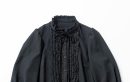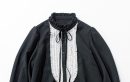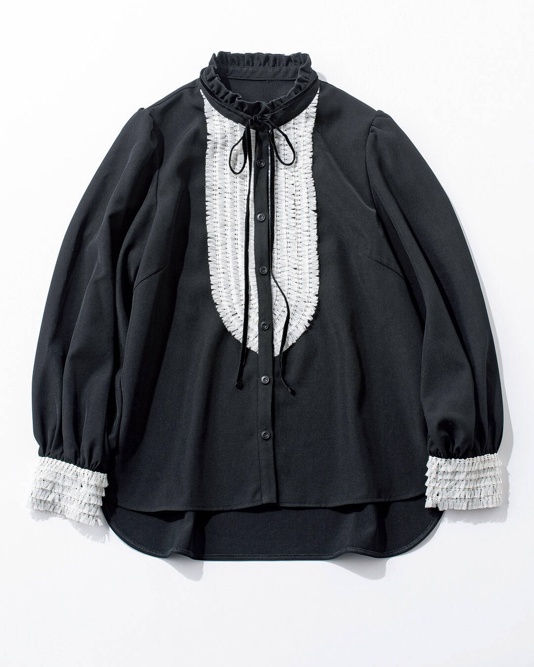 細かなフリルリボンを6メートルも贅沢にあしらったリュクス感あるブラウス。ジェンダーレスなシャツデザインのボディにフリルとリボンで1枚で甘ニッシュが完成します。インでもアウトでもバランスよく着られる着丈でサイドはラウンドカットでスリットを入れています。凝ったディテールでも自宅でお手入れが可能です。