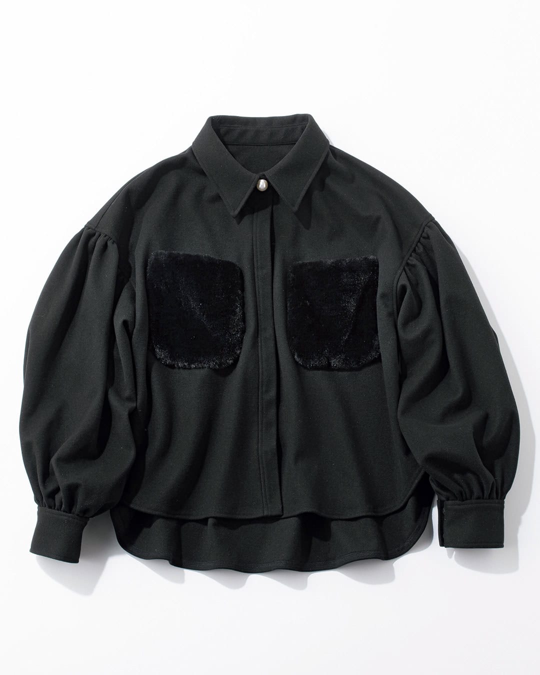 厚手のフラノ素材を使用したアウターにもなるブラウス。中にTシャツや薄手のニットも仕込めるので軽いアウターとして冬も活躍。大粒のパール、リュクス感あるエコファーのポケットとディテールが凝っているので、これ1枚でおしゃれ見えが叶います。袖のあしらい方でも印象変化が楽しめ、ヒップもカバーする前後差付きです。