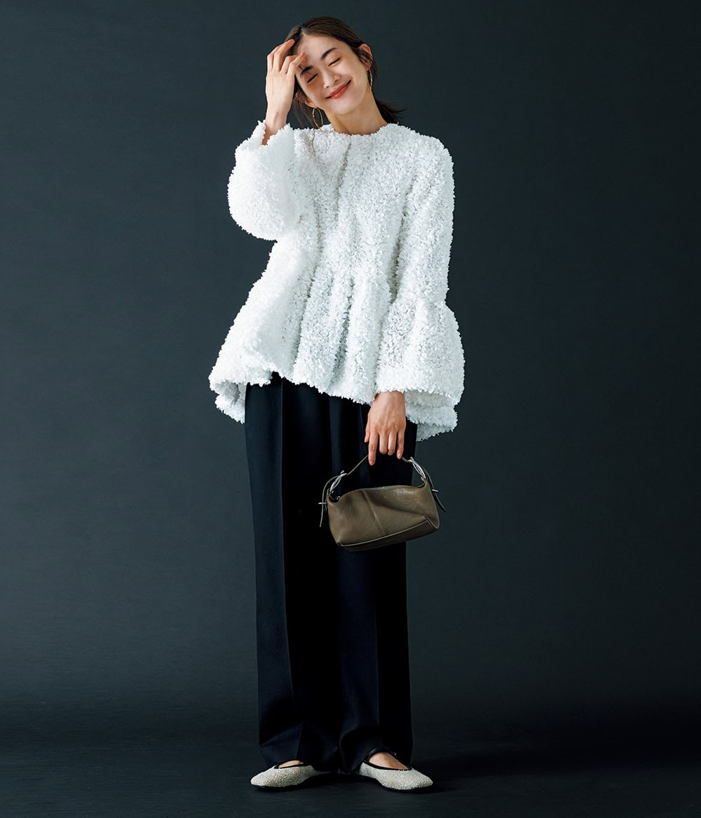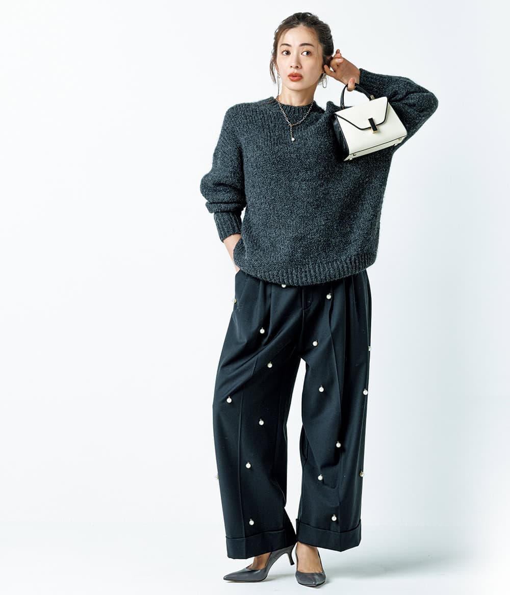 ニット46,200(サクラ/インターリブ)パール付きパンツ¥82,500(メイメイジェイ/エスケーシー)バッグ¥561,000(ヴァレクストラ/ヴァレクストラ ジャパン)パンプス¥22,000(オデット エ オディール/オデット エ オディール 新宿店)ピアス¥22,000(バルブス/ズットホリック)ネックレス¥13,750(ポピー・ケー/ロードス)