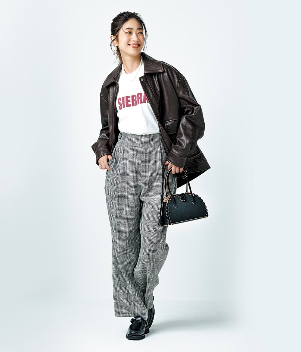 ジャケット¥231,000(ノア ハモア/ユナイテッドアローズ 麻布台ヒルズ ウィメンズストア)Tシャツ¥5,280(Mila Owen/Mila Owen ルミネ新宿2店)パンツ¥38,500(ウィム ガゼット/ウィム ガゼット 玉川髙島屋S・C店)バッグ¥42,900(メアリ オル ターナ/AL Design Inc.)ローファー¥83,600(ヘリュー/ギャルリー・ヴィー 丸の内店)ピアス¥39,600(ブランイリス/ブランイリス トーキョー)ネックレス¥13,200(Pearl for Life/ロードス)ソックス¥1,320(靴下屋/タビオ)