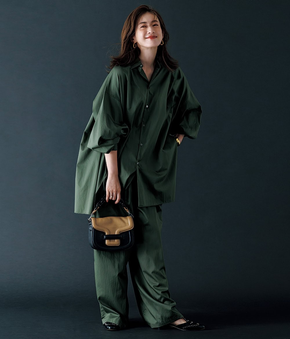 シャツ¥30,800パンツ¥30,800(ともにグラフペーパー/グラフペーパー 東京)バッグ¥220,000(ピエール アルディ/ピエール アルディ 東京)シューズ¥81,400(ネブローニ)ピアス¥36,300(ブランイリス/ブランイリス トーキョー)バングル¥59,400(ソコ/ズットホリック)リング¥10,800(アビステ)