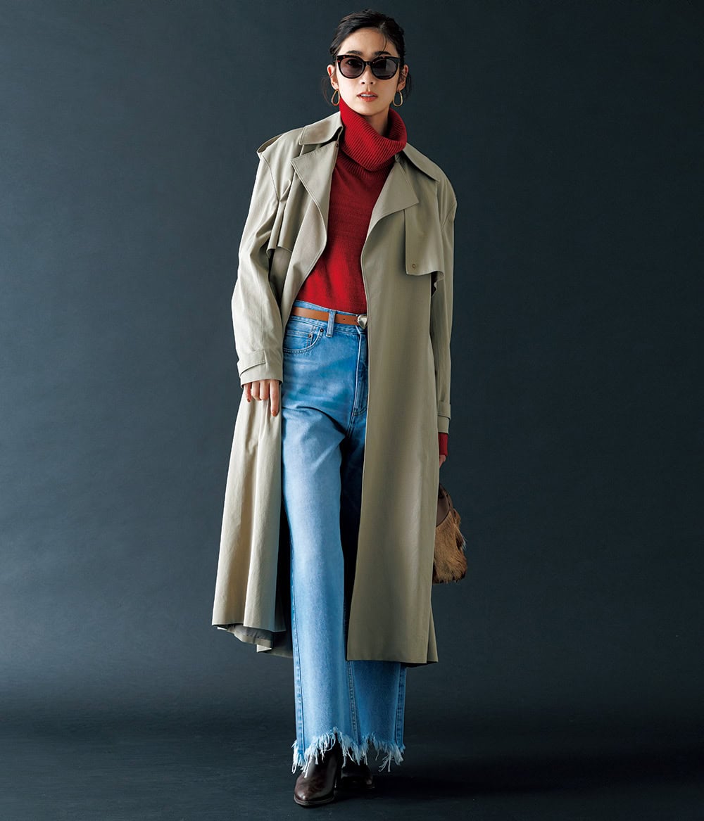 トレンチコート¥79,200(レハ/ユナイテッドアローズ 渋谷スクランブルスクエア店)ニット¥83,600(ラスパイユ/ザ エディット ストア)パンツ¥9,900(Mila Owen/Mila Owen ルミネ新宿2店)バッグ¥64,900(ジャンニ キアリーニ/ジャンニ キアリーニ 銀座店)ブーツ¥26,400(ダイアナ/ダイアナ 銀座本店)サングラス¥49,500(プロポ/プロポデザイン)ピアス¥55,000(リューク)ベルト¥12,100(レフィエ/フラッパーズ)