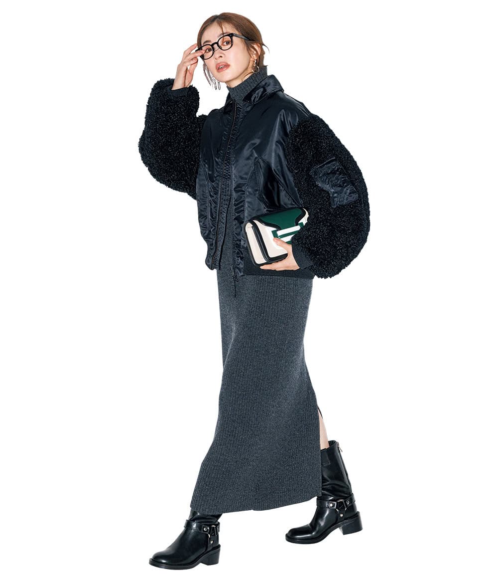 ブルゾン¥94,600(ハイク/ボウルズ)ワンピース¥53,900(サクラ/インターリブ)バッグ¥157,300(ピエール アルディ/ピエール アルディ 東京)ブーツ¥79,200(PIPPICHIC/ベイジュ)メガネ¥42,900(プロポ/プロポデザイン)ピアス¥30,800(ブランイリス/ブランイリス トーキョー)