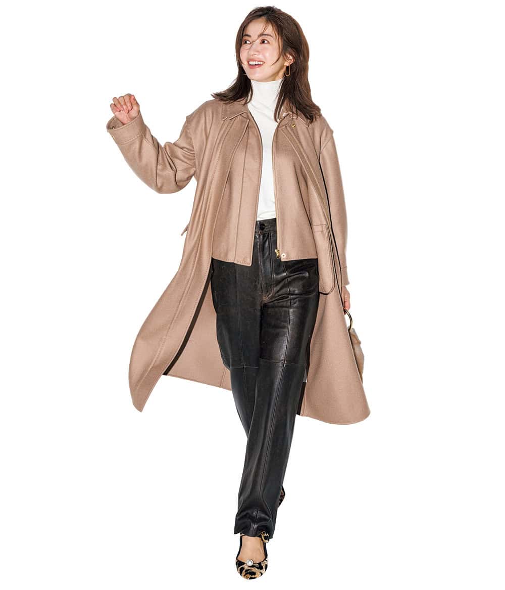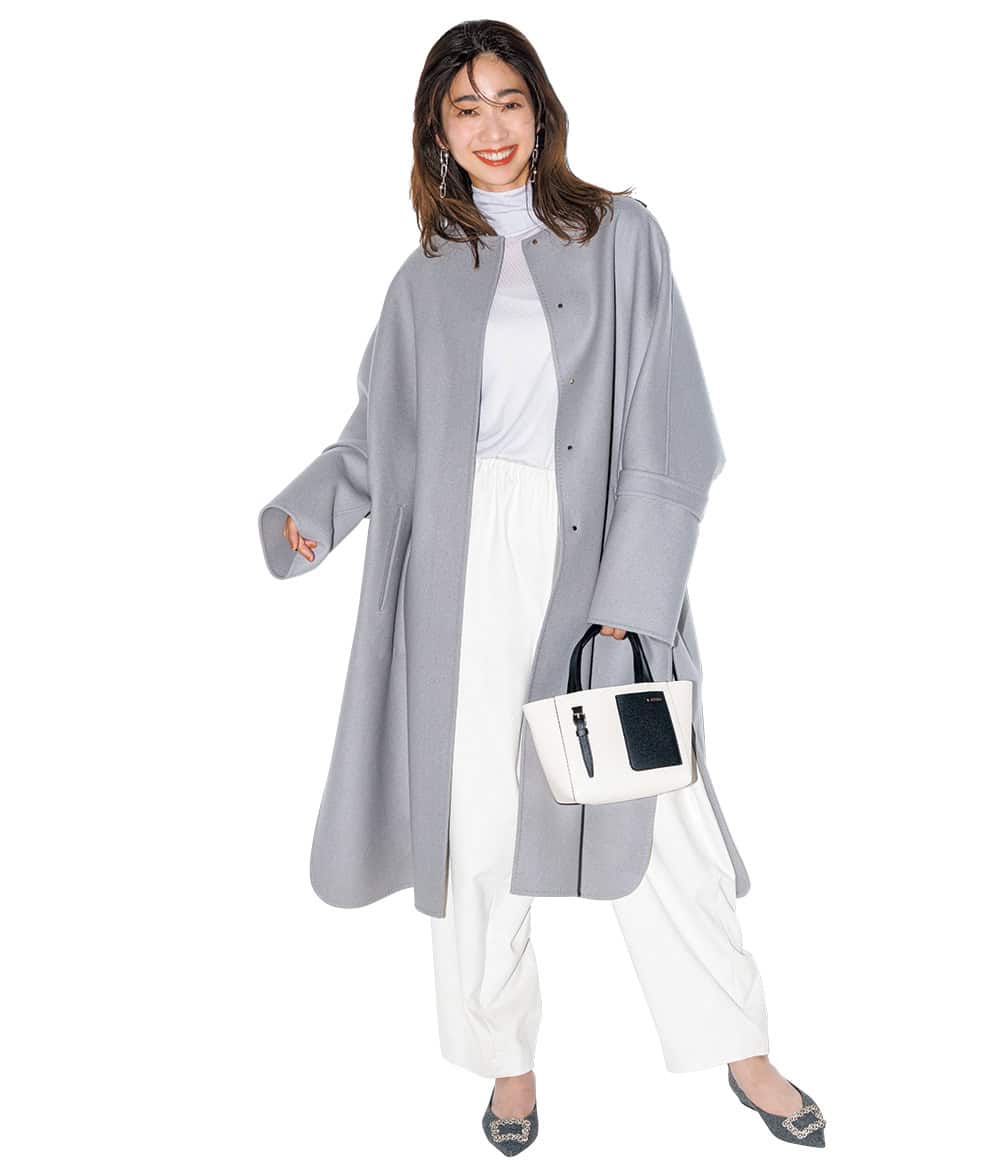 <右>コート¥99,000(エストネーション)ニット¥42,900(ギャルリー・ヴィー/ギャルリー・ヴィー 丸の内店)パンツ¥47,300(テラ/ティースクエア プレスルーム)バッグ¥71,500(メアリ オル ターナ/AL Design Inc.)パンプス¥73,700(ネブローニ)ピアス¥228,800リング¥177,100(ともにヒロタカ/ヒロタカ 表参道ヒルズ)