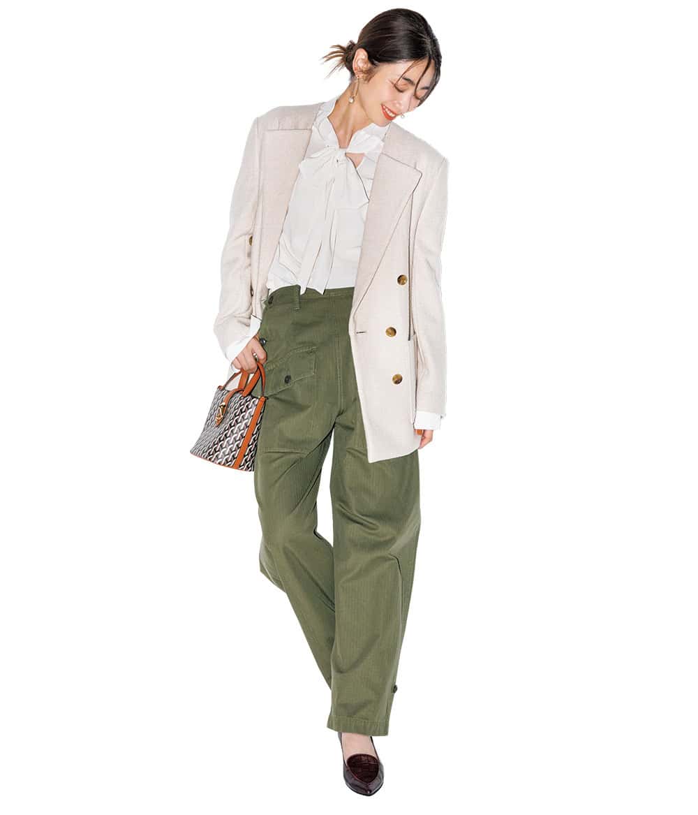 ジャケット¥99,000(アキラナカ)ブラウス¥19,800(MIESROHE/MIESROHE ルミネ新宿1店)パンツ[11月発売予定]¥22,000(アンド アールシー/カレンソロジー 二子玉川)バッグ¥40,700(DELL’EST/FAVORITE SUKINAMONO)シューズ¥28,600(ヨシト/ニューロンドン)ピアス¥6,600(アビステ)
