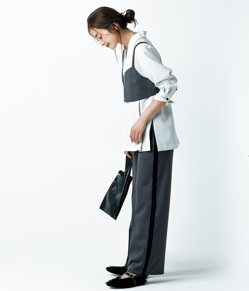 ノースリーブジレ¥53,900ブルゾン¥61,600(ともにイネド/フランドルカスタマーサービス)ニット[10月上旬発売]¥19,800(アンクレイヴ/オンワード樫山 お客様相談室)パンツ¥93,500(エディション/エディション 表参道ヒルズ店)バッグ¥53,900(カルス/アマン)シューズ¥46,200(PIPPICHIC/ベイジュ)ピアス¥50,600(フェルセラ/ズットホリック)