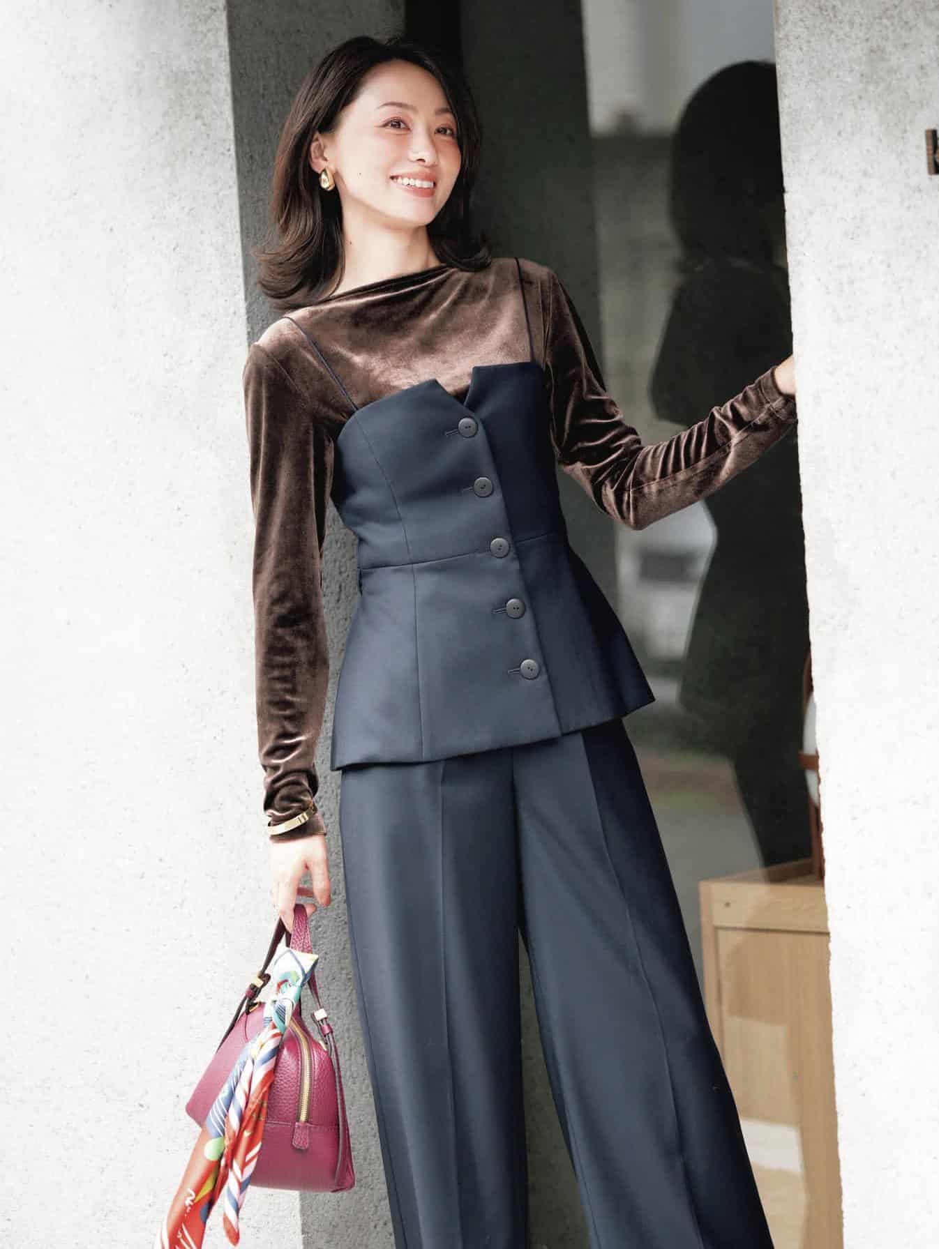 どんな場にもマッチする王道な黒パンツスタイルが安心。ビスチェをあわせてより知的な雰囲気を演出。インナーは、白でなくあえてこっくりカラーを選んで爽快に仕上げるのがGOOD!