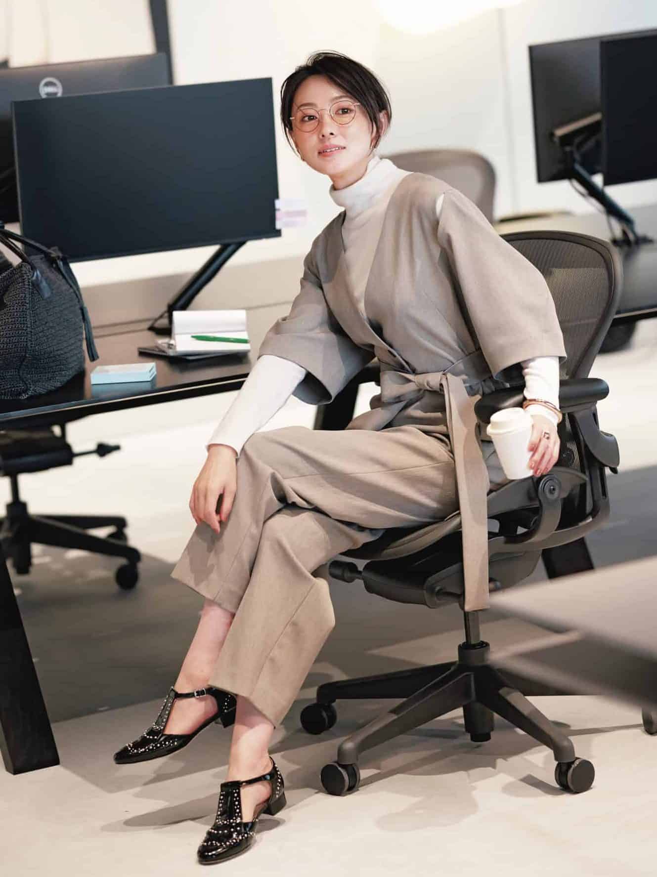 ジャケット¥85,800(theory luxe)タートルカットソー¥13,200(ヴェルソー/ジオン商事)パンツ¥30,800(コムサ/ファイブフォックス カスタマーサービス)バッグ¥99,000〈マエストソ〉フラットシューズ¥35,200〈ペリーコ サニー〉(ともにアマン)スカーフ¥22,000(マニプリ)メガネ¥49,500(アイヴァン/アイヴァン 東京ギャラリー)ネックレス¥16,500(イットアトリエ/フォーティーン ショールーム)時計¥17,600(アビステ)