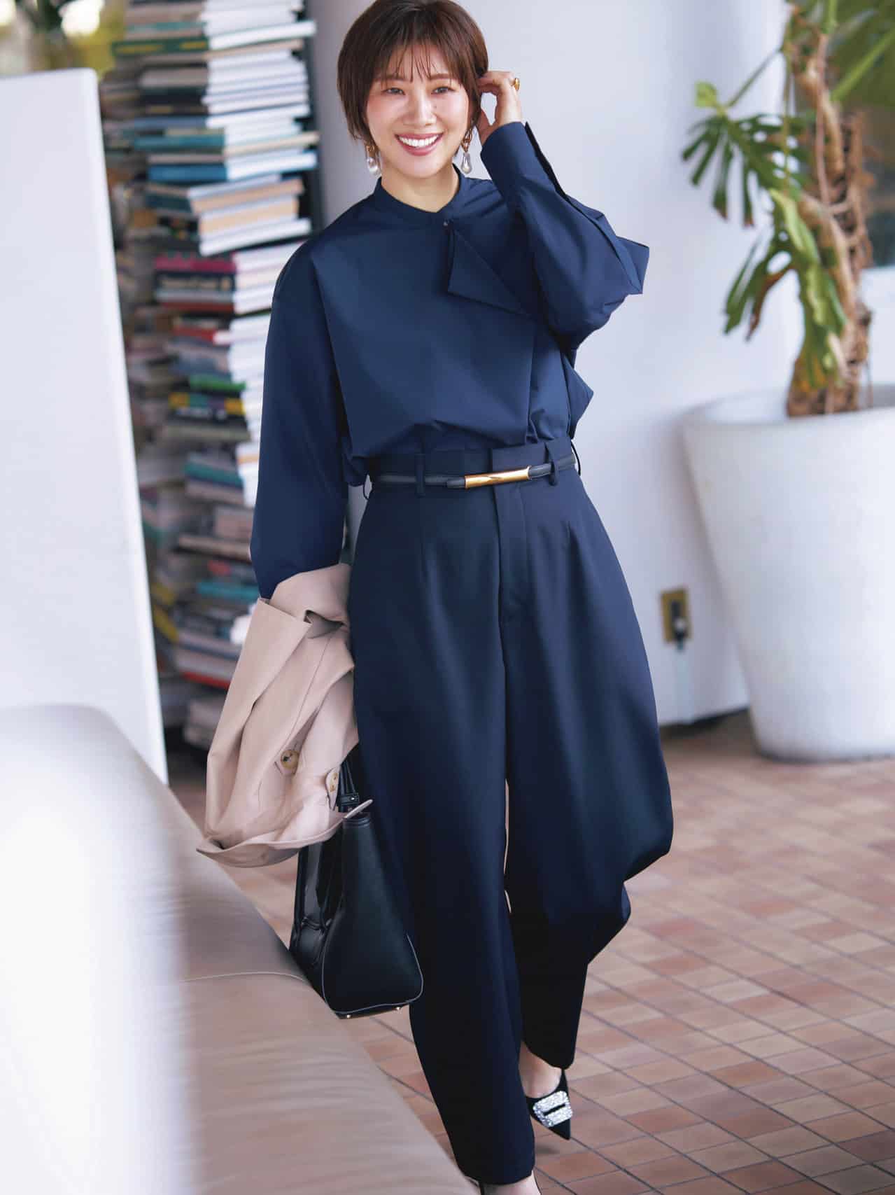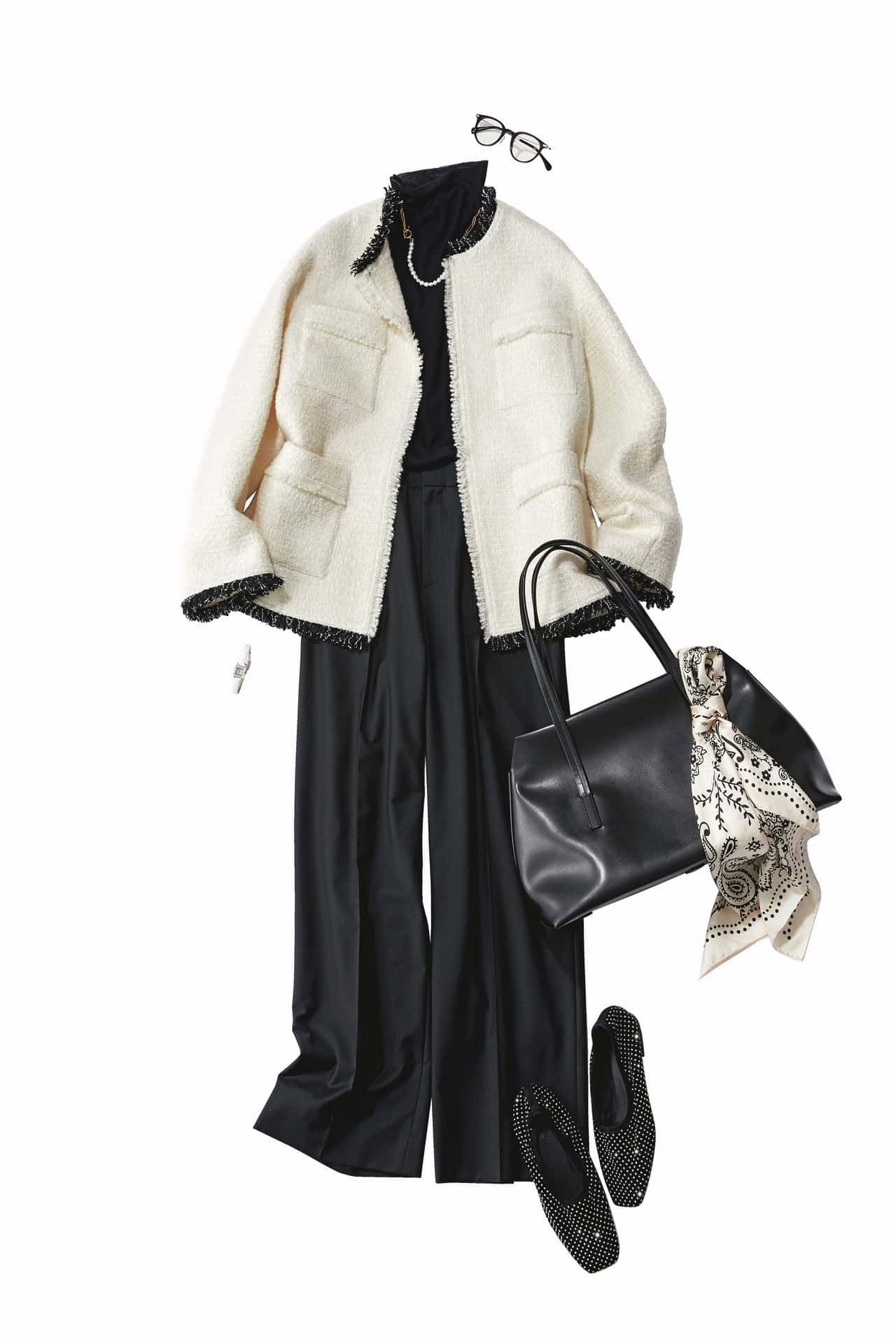 ジャケット¥85,800(theory luxe)タートルカットソー¥13,200(ヴェルソー/ジオン商事)パンツ¥30,800(コムサ/ファイブフォックス カスタマーサービス)バッグ¥99,000〈マエストソ〉フラットシューズ¥35,200〈ペリーコ サニー〉(ともにアマン)スカーフ¥22,000(マニプリ)メガネ¥49,500(アイヴァン/アイヴァン 東京ギャラリー)ネックレス¥16,500(イットアトリエ/フォーティーン ショールーム)時計¥17,600(アビステ)