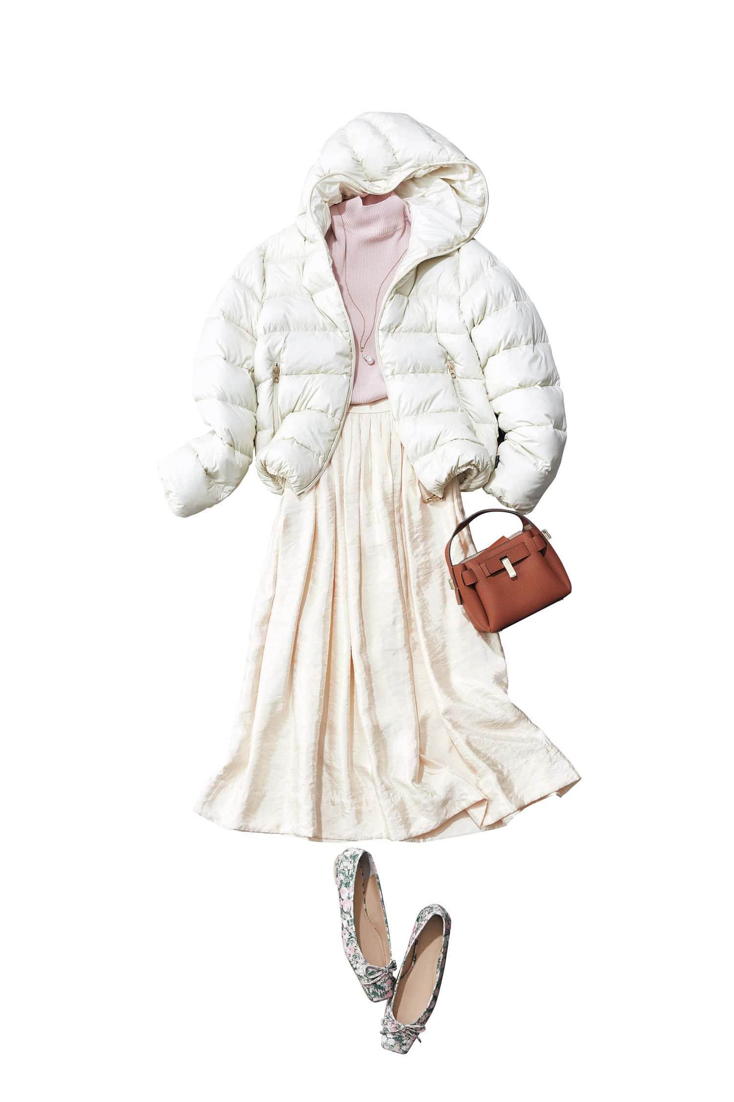 ホワイトダウンジャケット¥140,800(デュベティカ/F.E.N.)ピンクハイネックニット¥8,800(SNIDEL/SNIDEL ルミネ新宿2店)スカート¥27,500(マリリンムーン/マリリンムーンオンラインストア)バッグ¥42,900(PUNTI./エルディスト ショールーム)パンプス¥27,500(ツル バイ マリコ オイカワ)ネックレス¥28,600(インツーデザイン/ZUTTOHOLIC)撮影/西出健太郎〈人物〉、魚地武大(TENT)