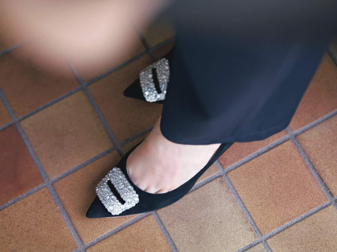 大ぶりなスクエア型のシルバーのビジューが暗色コーデを彩ります。シャープなシルエットに後押しされ、より美しく上品な印象に。華やかなパンプスも、ローヒールなら気負わずに楽しめそうです!