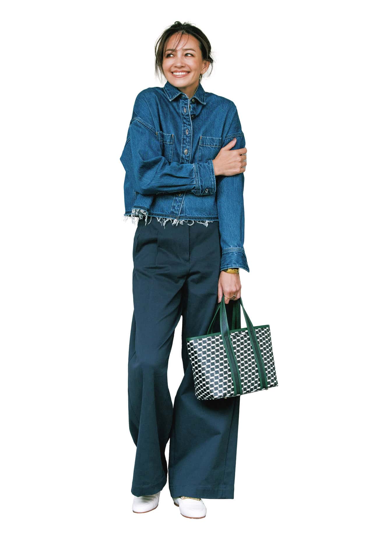デニムシャツジャケット¥42,900(サクラ/インターリブ)Tシャツ¥9,790(マイストラーダ/マイストラーダ プレスルーム)パンツ¥33,800(テラ/ティースクエア プレスルーム)バッグ¥207,900(ピエール アルディ/ピエール アルディ 東京)シューズ¥135,300(トッズ/トッズ・ジャパン)ベルト¥31,900(RH ヴィンテージ/ロンハーマン)ピアス¥25,300ダブルリング¥40,700(ともにリューク)バングル¥41,580(ソコ/ZUTTOHOLIC)