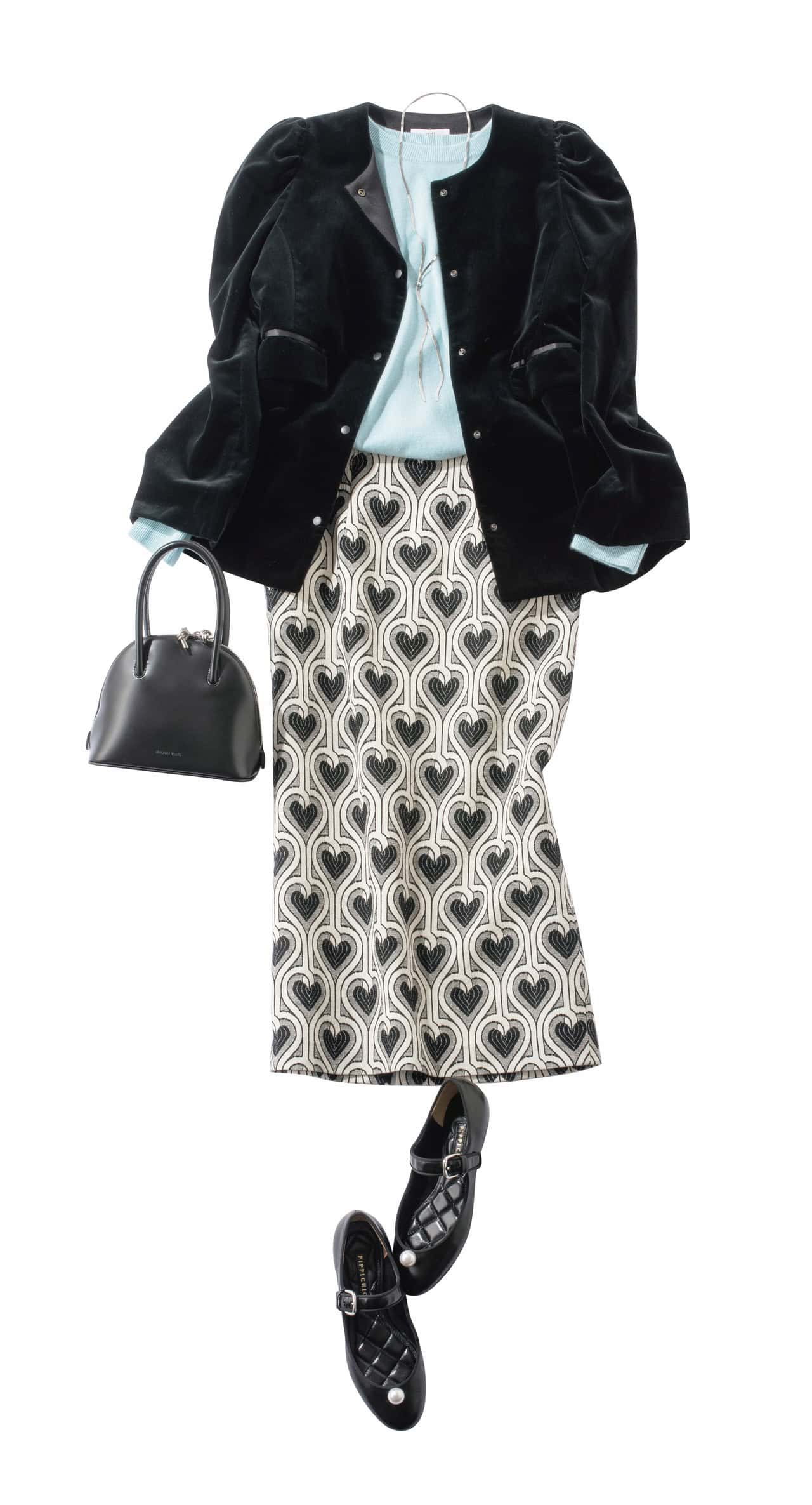 ベロアジャケット¥46,200(yori)ニット¥28,930(23区)ハートタイトスカート¥49,500(ルル・ウィルビー/アルアバイル)バッグ¥60,500(メゾンヴァジック/ヴァジックジャパン)パンプス¥46,200(ピッピシック/ベイジュ)ネックレス¥2,200(スリー フォー タイム/ジオン商事)