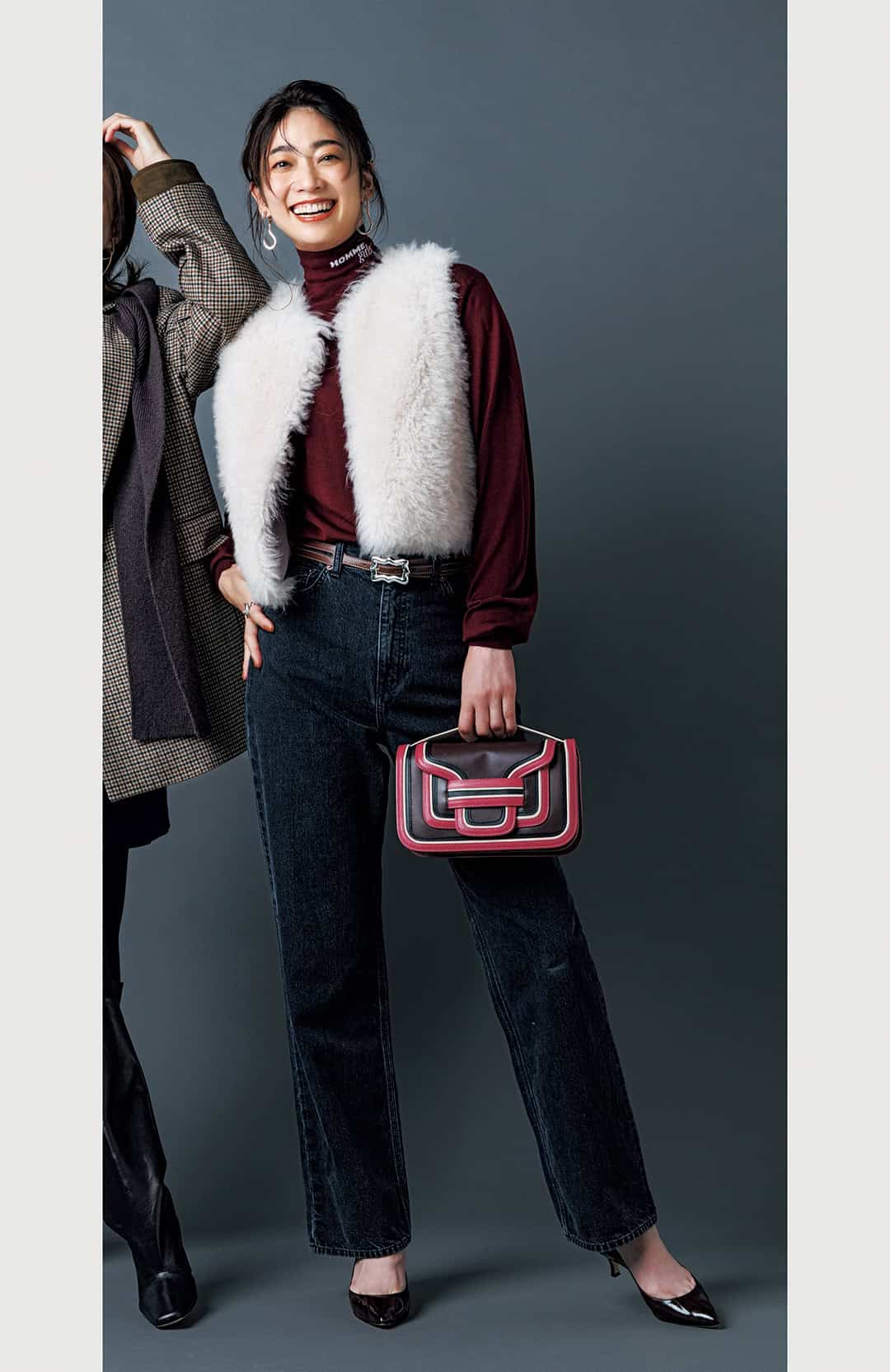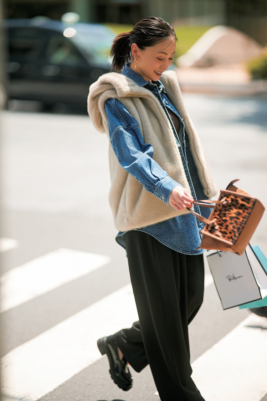 ファーベスト¥25,300(アルページュストーリー)デニムシャツ¥47,300(サクラ/インターリブ)タンクトップ¥19,800(ハイク/ボウルズ)パンツ¥16,500(ico/Siro Co., Ltd.)バッグ※送迎¥17,600(ノマディス/ノーベルバ)バッグ※自分時間¥75,900(ジャンニ キアリーニ/ジャンニ キアリーニ 銀座店)ローファー¥26,950(スタッカート/バロックジャパンリミテッド)イヤリング¥41,800(ブランイリス/ブランイリス トーキョー)