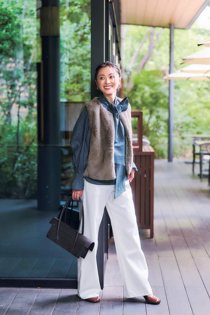 ジレ¥9,790(スパン)ニット¥18,920(アンクレイヴ/アンクレイヴ〈オンワード樫山〉)パンツ¥23,100(コエル/ビッグヒット)バッグ¥53,900(オルセット/オルサ)シューズ¥19,800(ル タロン グリーズ/ル タロン グリーズ ルミネ新宿店)ピアス¥61,600(モニス/フォーティーン ショールーム)リング¥73,700(マリハ)