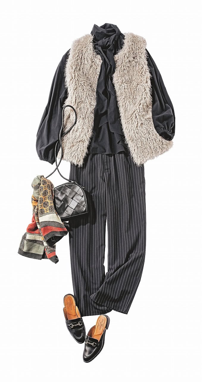 ファージレ×上品ブラウスで奥行きを演出。ブラックスタイルに華やぎを添えて地味見えしがちな秋冬コーデも格上げします。ストライプのパンツで締めれば、甘辛バランスが絶妙な洗練された着こなしに。