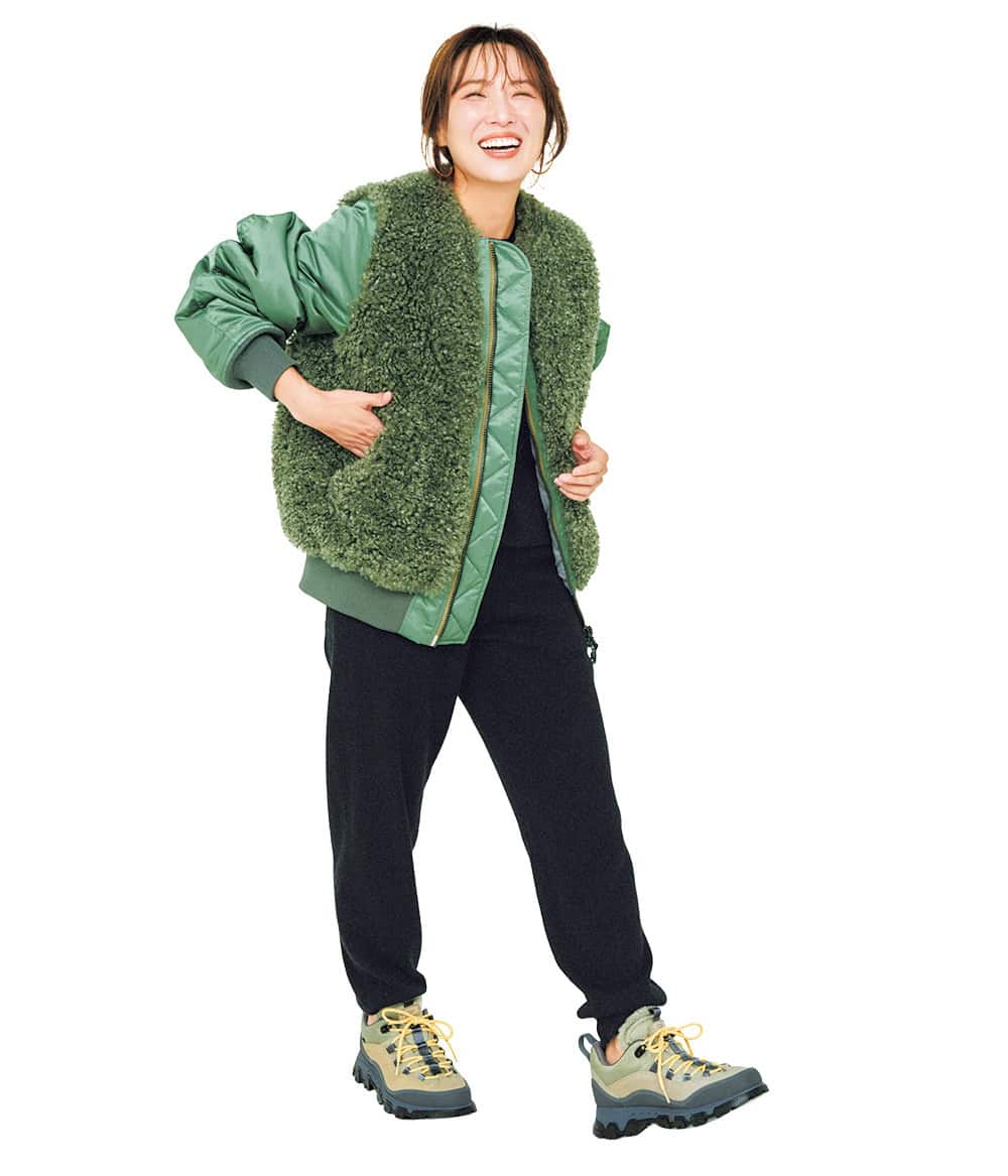 スニーカー¥38,500(アグ®/デッカーズジャパン)ブルゾン¥91,300ピアス¥49,500(ともにハイク/ボウルズ)ニットセットアップ¥58,300(cash & barba/エグジステンス)