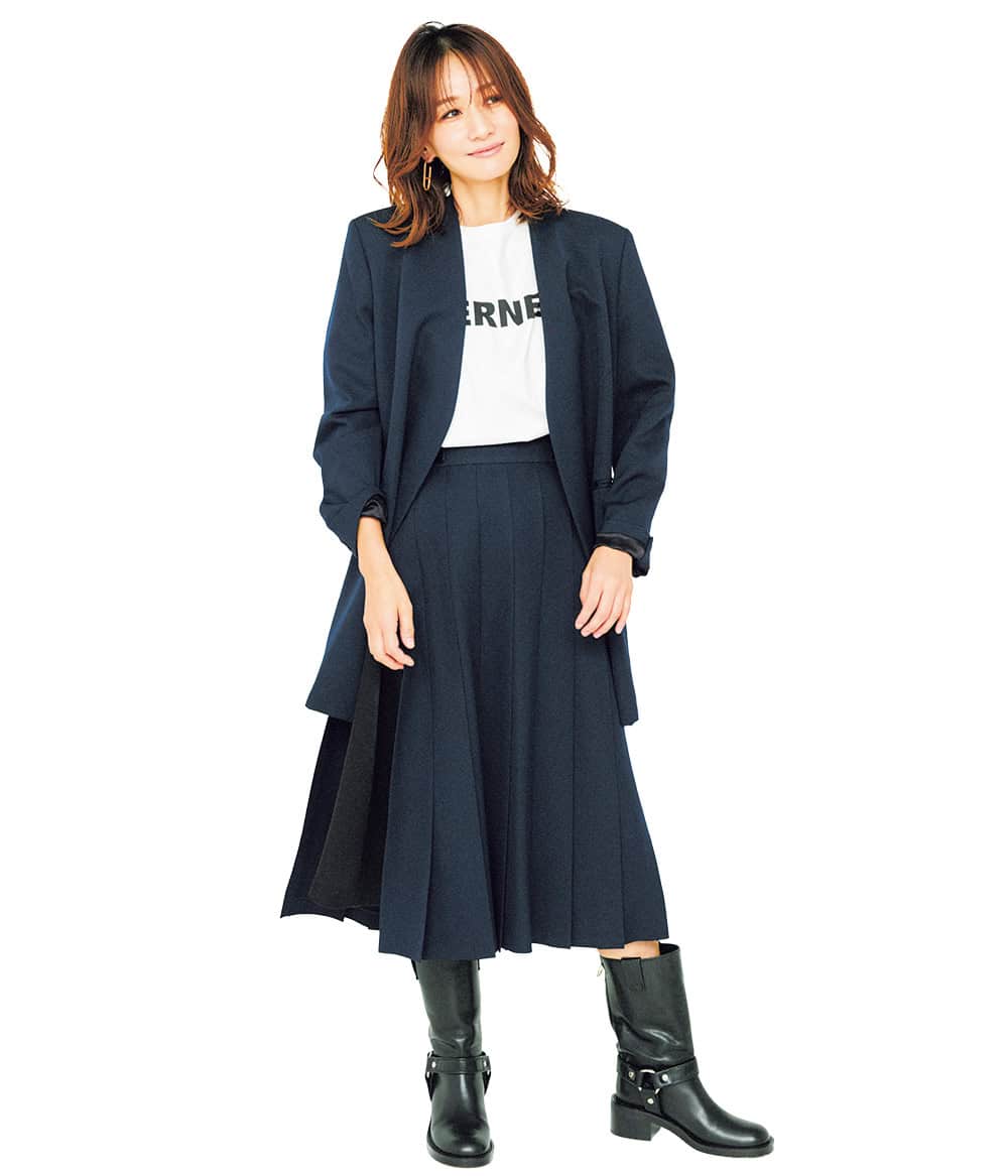ブーツ¥79,200(PIPPICHIC/ベイジュ)ジャケット¥99,000スカート¥79,200(ともにアドーア)Tシャツ¥7,920(ドレステリア/ドレステリア 渋谷スクランブルスクエア店)ピアス¥36,740(ベン・アムン/ズットホリック)
