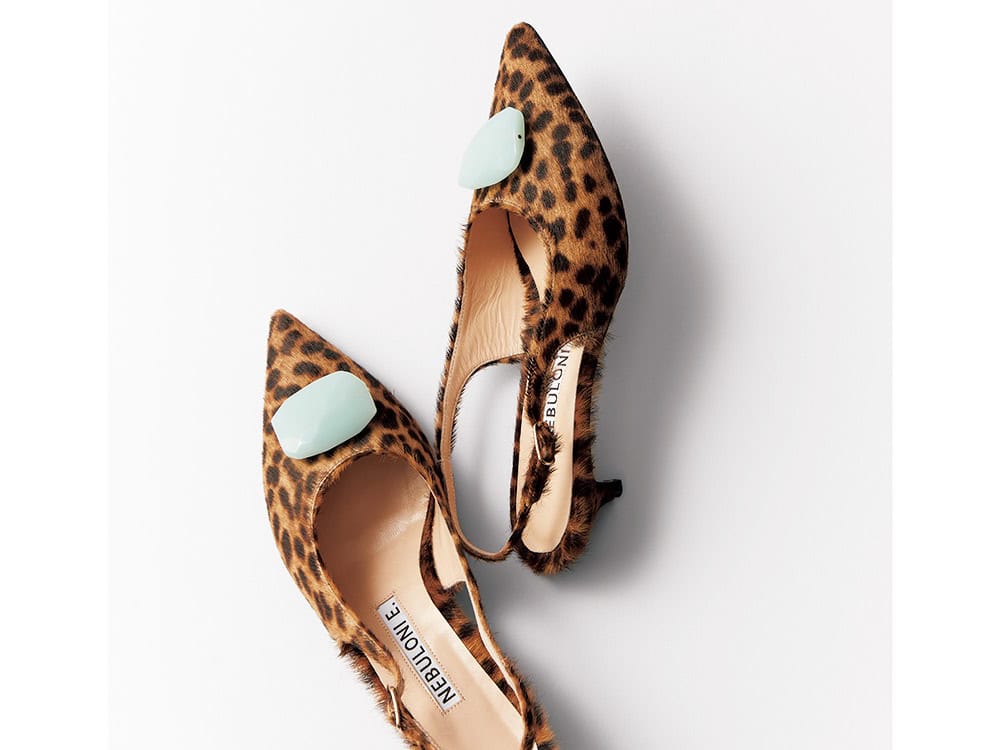 ひと匙の遊び心が正解。旬の茶ワントーンにヒョウ柄を効かせたり、パステルカラーに合わせれば甘さを引き締めてくれます。エメラルドグリーンのストーンでヒョウ柄が優しげに。