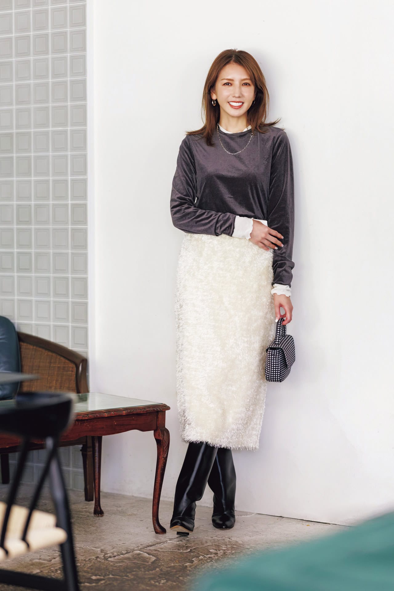 シアーベロアプルオーバー(チャコールグレー)¥13,200シアーベロアプルオーバー(ホワイト)¥13,200(ともにシークレット・トロフィー)スカート¥24,200(アンタイトル)バッグ¥18,700(ツル バイ マリコ オイカワ)ブーツ¥110,000(ネブローニ)ピアス¥3,3{hlb}00(デイジールイス/ロードス)ネックレス¥17,600(ココシュニック オンキッチュ/ココシュニック)