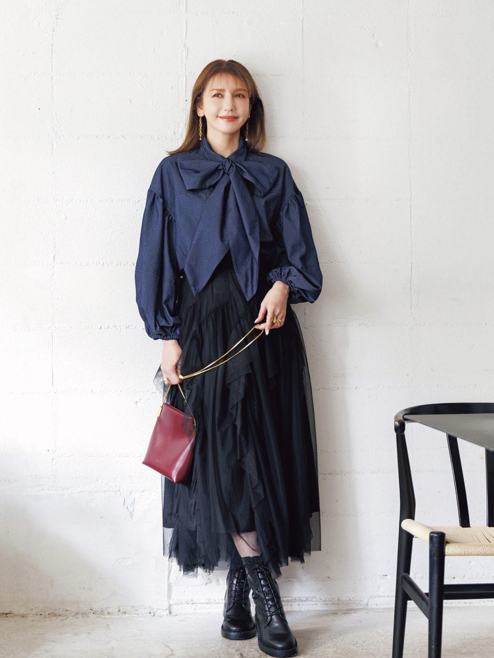 リボンデニムブラウス¥18,700(シークレット・トロフィー)スカート¥24,200(アルページュストーリー)バッグ¥69,300(マエストソ/オブリオ)ブーツ¥60,500(ツル バイ マリコ オイカワ)ピアス¥7,700〈MU〉リング[左手人さし指・中指]¥3,520〈ヘンカ〉リング[左手薬指]¥27,500〈mysha〉リング[右手]¥31,900〈Pearl for Life〉(すべてロードス)