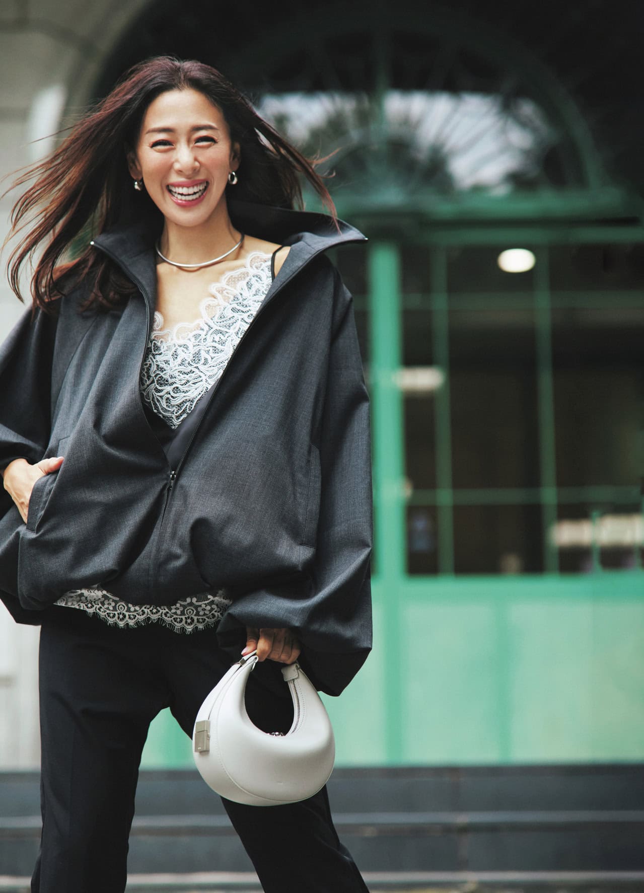 キャミソール¥18,700(プランクプロジェクト/プランクプロジェクト 青山店)ブルゾン¥86,900(アンスクリア/アマン)パンツ¥38,500(カオス/カオス丸の内)バッグ¥44,000(オソイ/ユナイテッドアローズ 渋谷スクランブルスクエア店)チョーカー¥86,900〈ニナ・エ・ジュール〉ピアス¥22,000〈カラ・ユ〉(ともにショールーム ロイト)