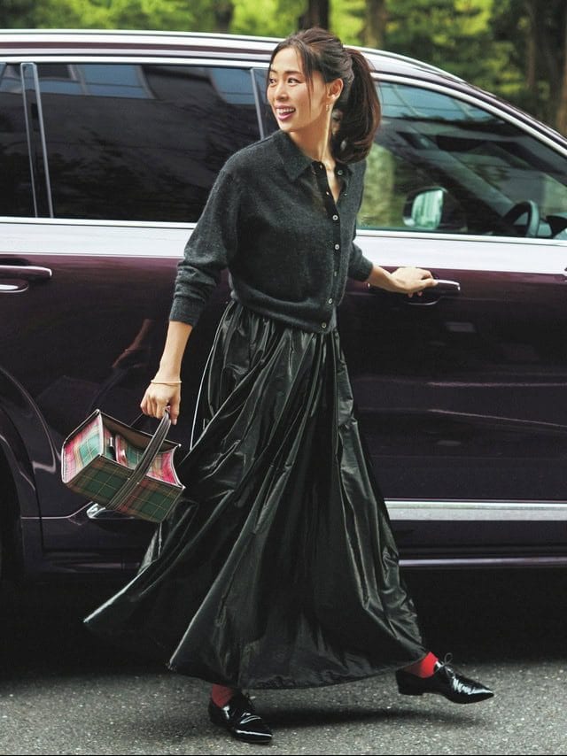 サテンスカート¥14,300(MARW/ユナイテッドアローズカスタマーサービスデスク)ニット¥42,900(サクラ/インターリブ)バッグ¥42,900(アバケーション)シューズ¥73,700(ネブローニ)ソックス¥3,630(パンセレラ/真下商事)ネックレス¥19,800(シャルロット ウーニング/フラッパーズ)ピアス¥38,500ブレスレット¥35,200(ともにプラウ)