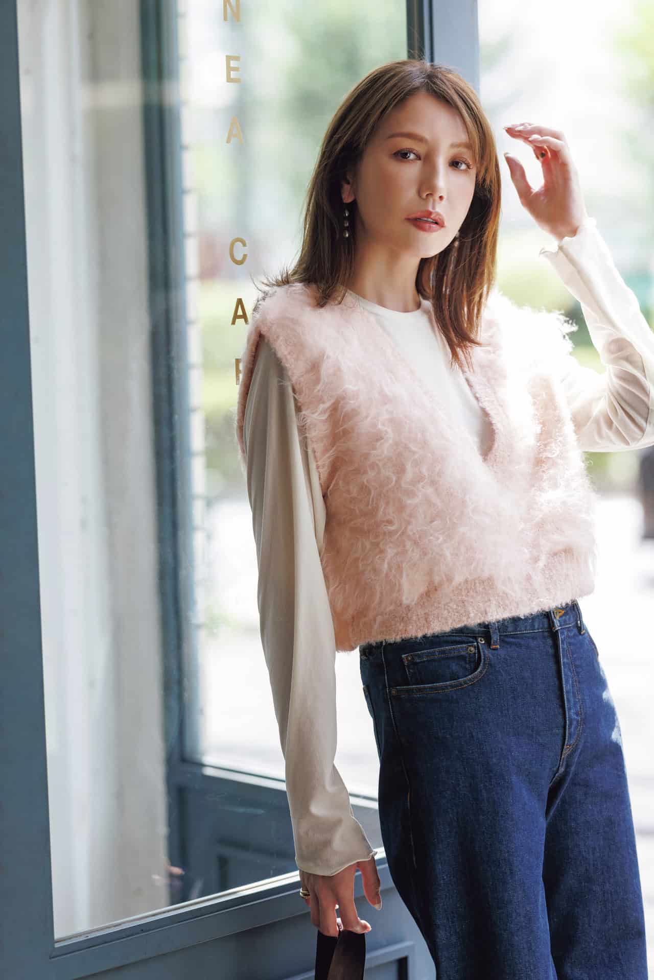 ふわもこ素材が季節感を添え、纏うだけでやさしく華やかな印象に。いつものTシャツやブラウスに重ねるだけで立体感が生まれ、装いがぐっとこなれて見えます。淡いピンクの色味が大人の可愛げを引き立て、深めVネック×ショート丈でスタイルアップ効果も。フェミニンと抜け感を両得できる、この冬の旬顔レイヤードアイテムです。