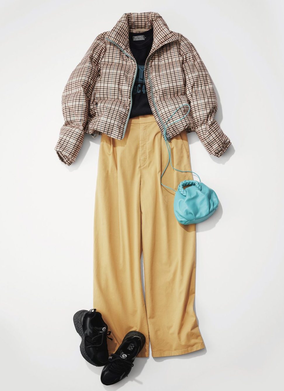 チェック柄ダウンジャケット¥104,500(ウールリッチ/ウールリッチ 二子玉川店)サーマルカットソー¥22,000(ヒステリックグラマー)パンツ¥39,600(ベイジ,/オンワード樫山 お客様相談室)バッグ[別注カラー]¥71,500(HEREU/ebure/リトルリーグ インク)スニーカー¥29,700(ノーネーム/ストックマン)