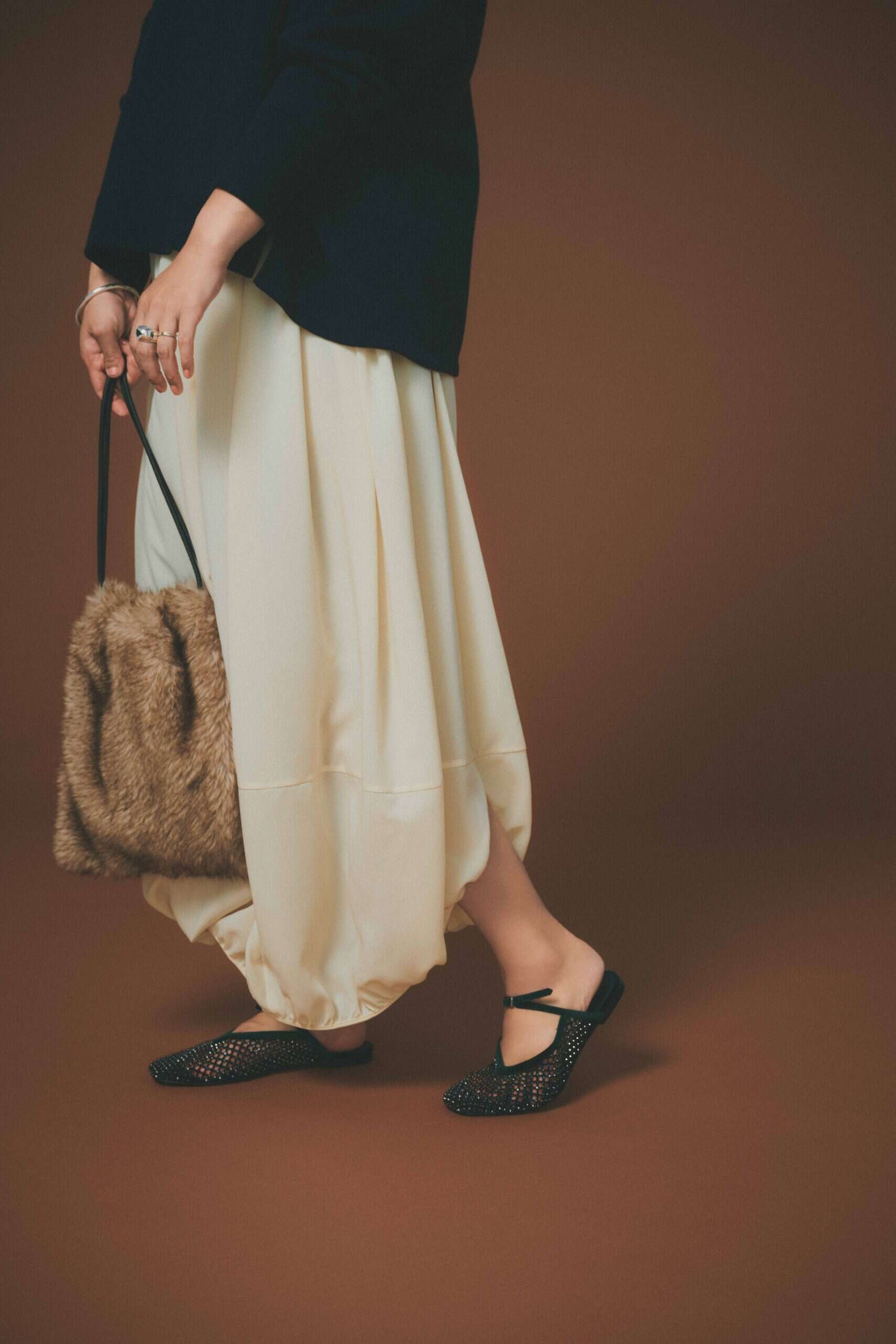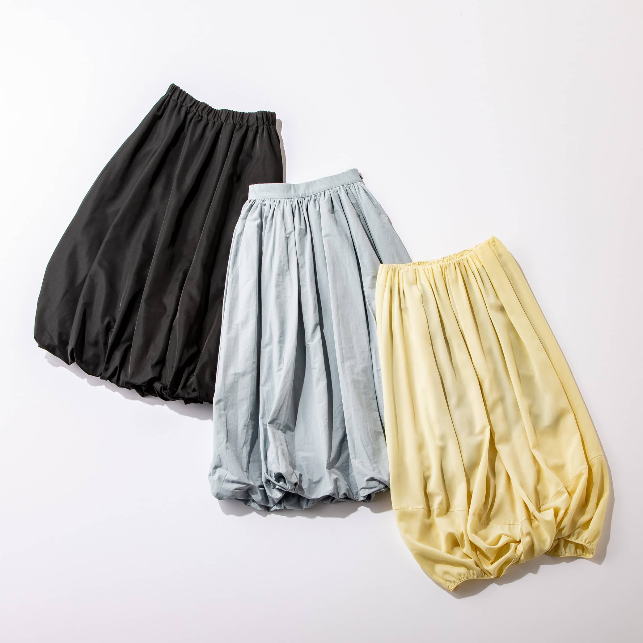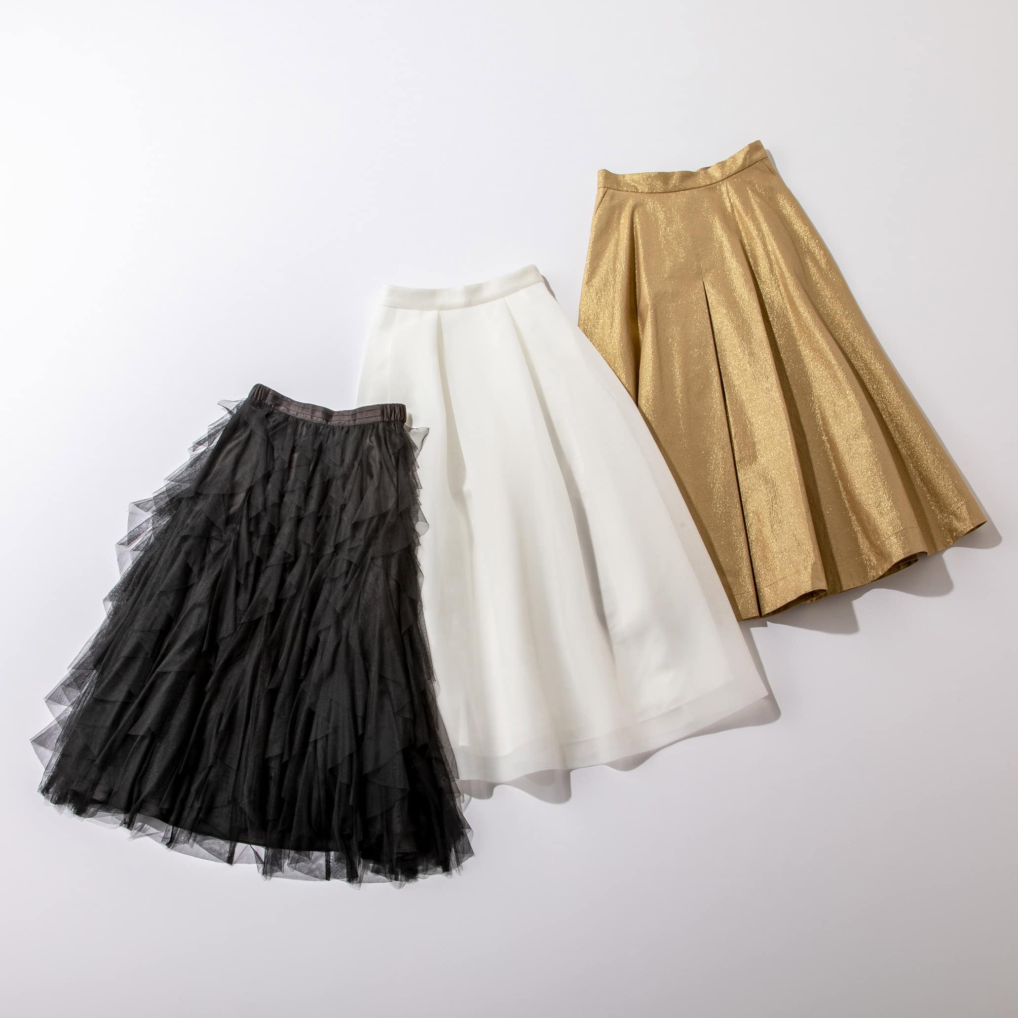 1枚でコーデが華やかになる着映えスカートは、イベントシーンの強い味方に。(右から)ゴールド¥71,500(オブリオ)ホワイト¥14,300(アパートバイ)ブラック¥41,800(ルル・ウィルビー/アルアバイル)