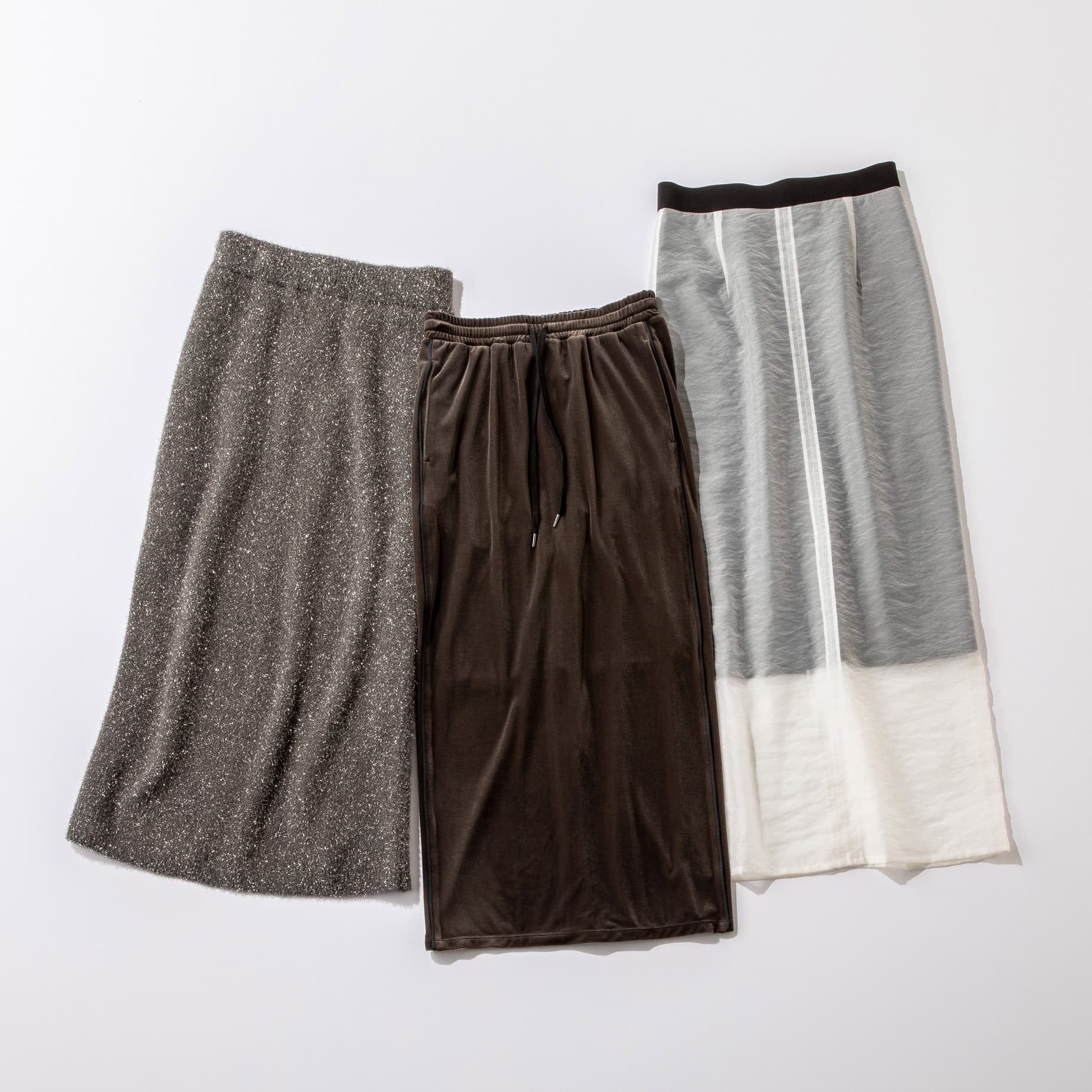 シアーにベロア、ラメなど、素材感の違いでコーデの幅もグッと広がる。ゴムのウエストでストレスフリー。(右から)ホワイト¥26,400(アルアバイル)グレージュ¥9,350(ジャーナルスタンダード レリューム)グレー¥7,590(ビーミング by ビームス)