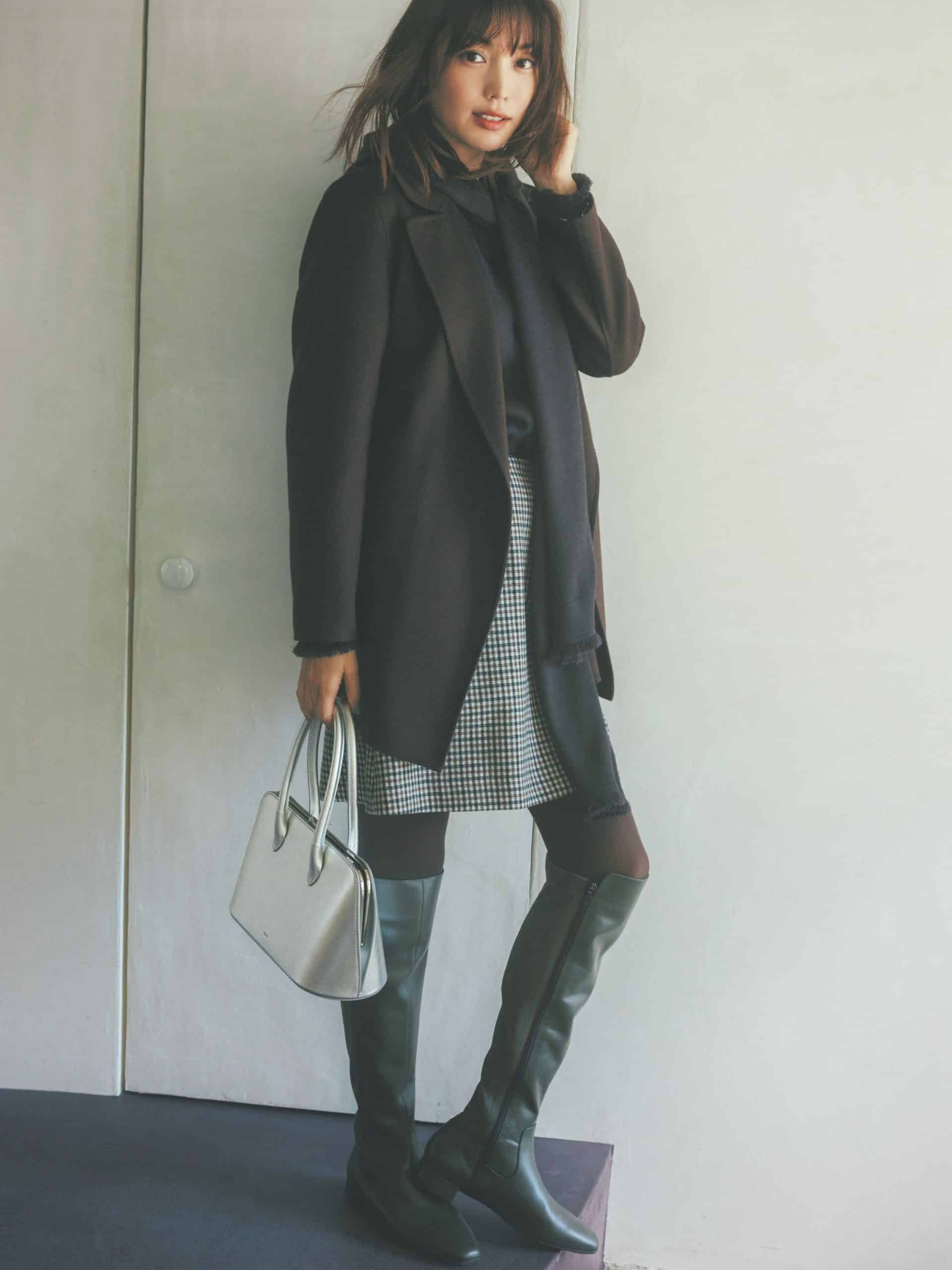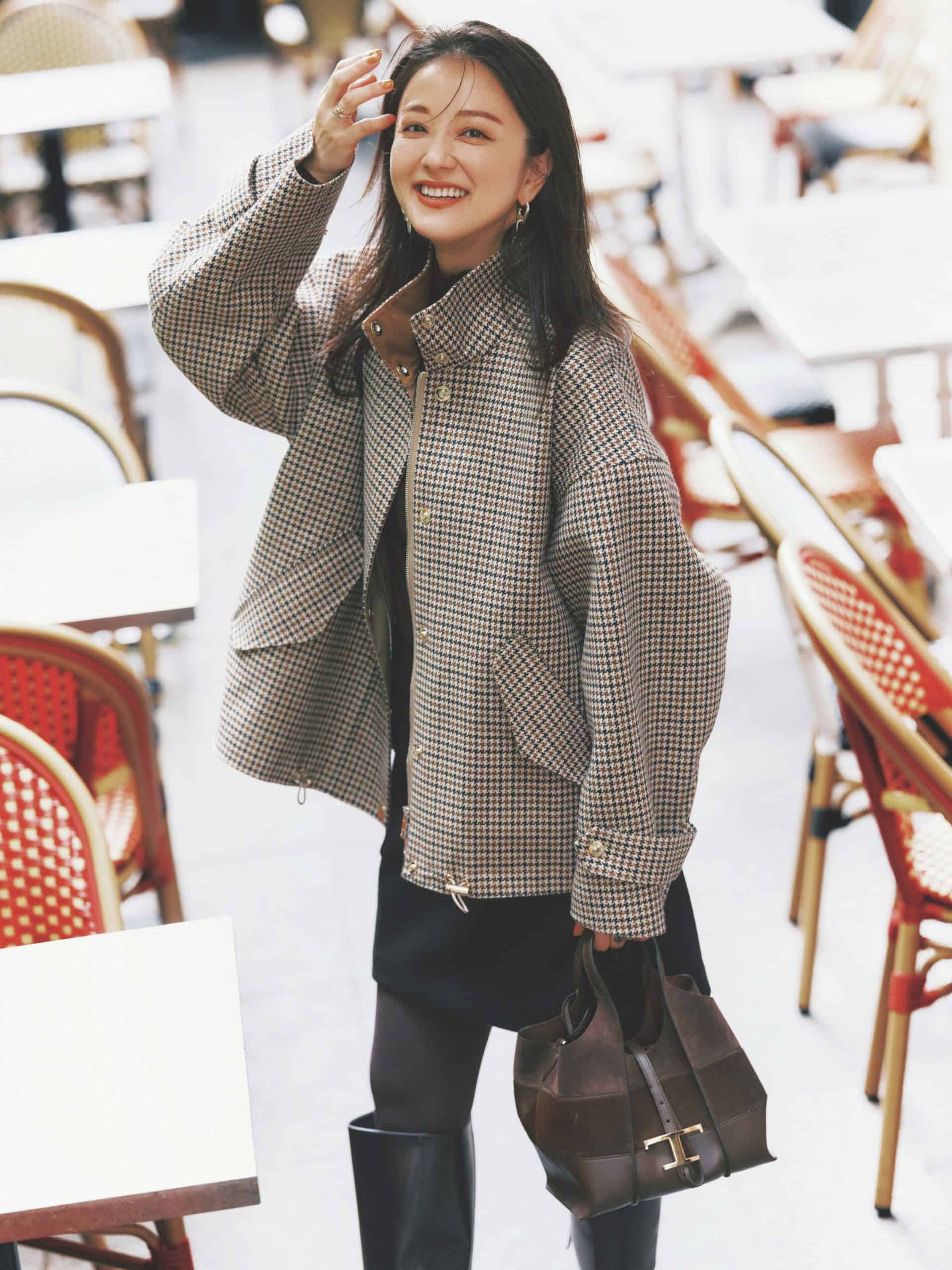 今年気になるショート丈のスカートは、シックに仕上げるのがコツ。トラディショナルなブラウンチェック柄でをチョイスするだけで、大人のスタイリングにシフト◎。ブーツで露出感をセーブするのがポイントです。