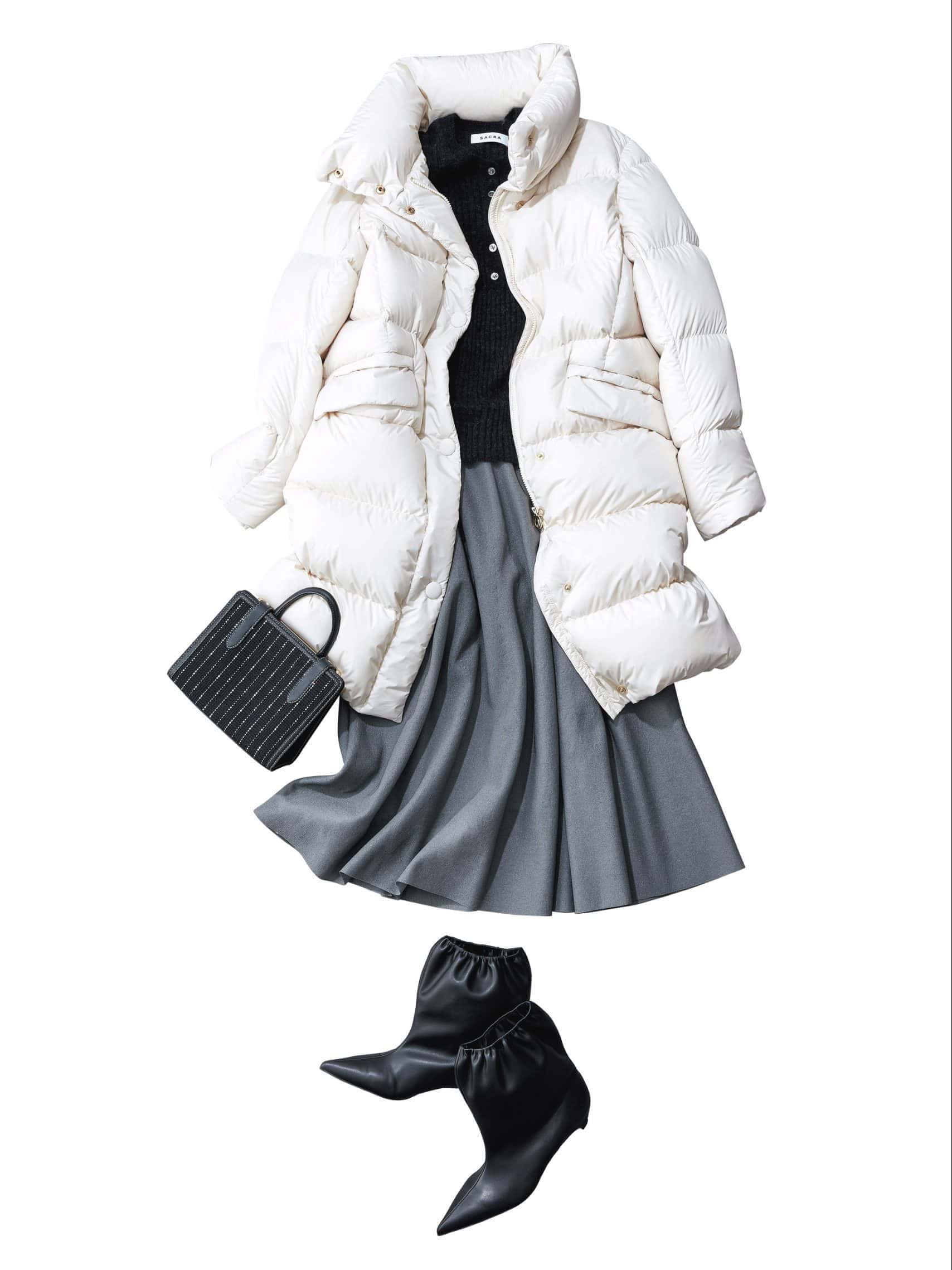 スポーティになりがちなロング丈ダウンは、スカートを合わせることで“おめかし”スタイリングにシフトが可能。可愛らしさを残しながらも、程良いボリューミーなシルエットでこなれた雰囲気に。白ダウンなら、スカートはグレーをチョイスするとより品よく仕上がります。