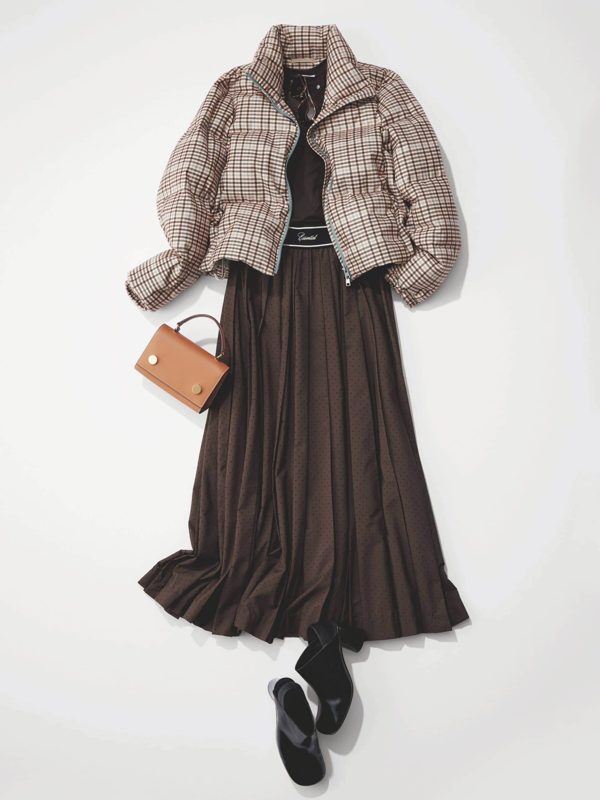 今年はブラウンのスカートが1着あると、旬のブラウンアイテムを受け止められるのでおすすめです。黒にもブラウンにも、どんなカラーにも合う色味だと、使い勝手も最高。キャッチーなチェック柄ダウンも、すっきりとまとまります。
