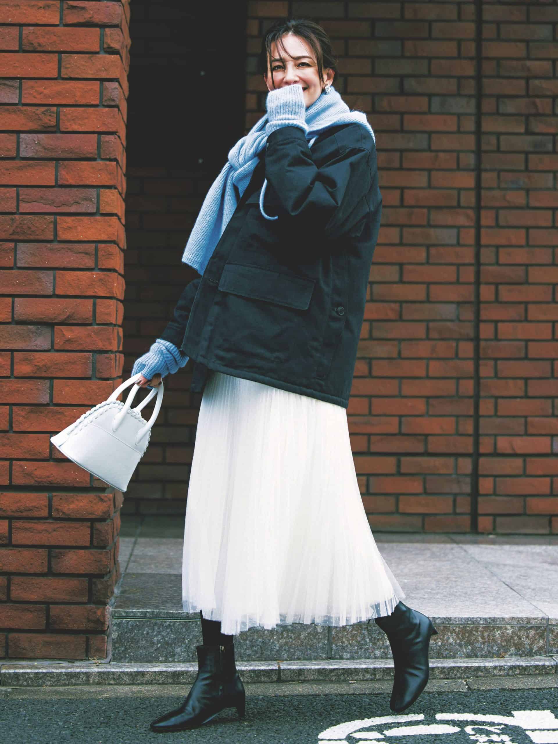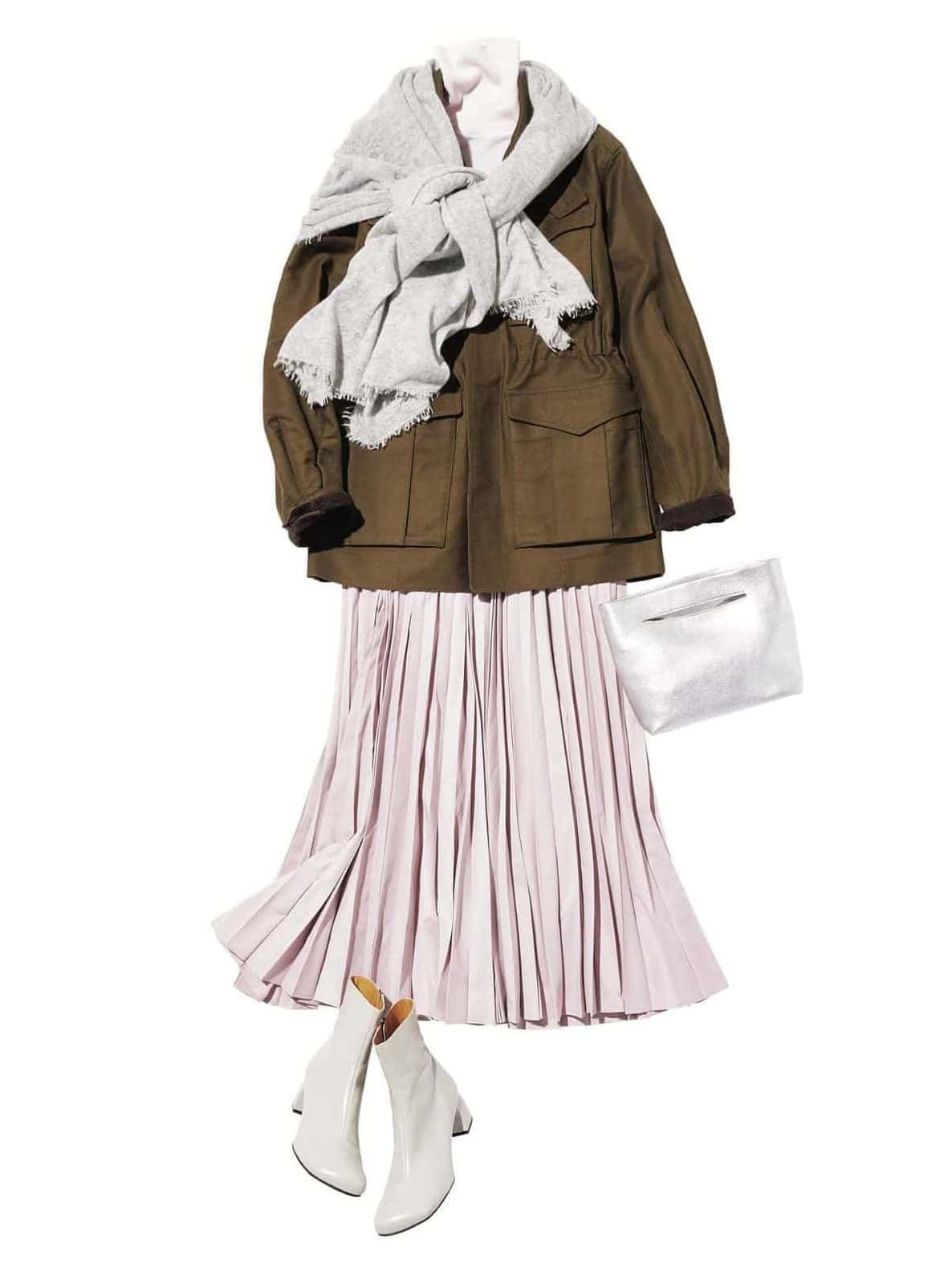 一見ギャップのある深いカーキとペールピンクは、実は相思相愛の組み合わせ!アウターのメンズライク感をキュートなスカートで解消し、女性らしい軽やかな印象に。雪色の小物で彩ると、より今シーズンっぽさが高まります。